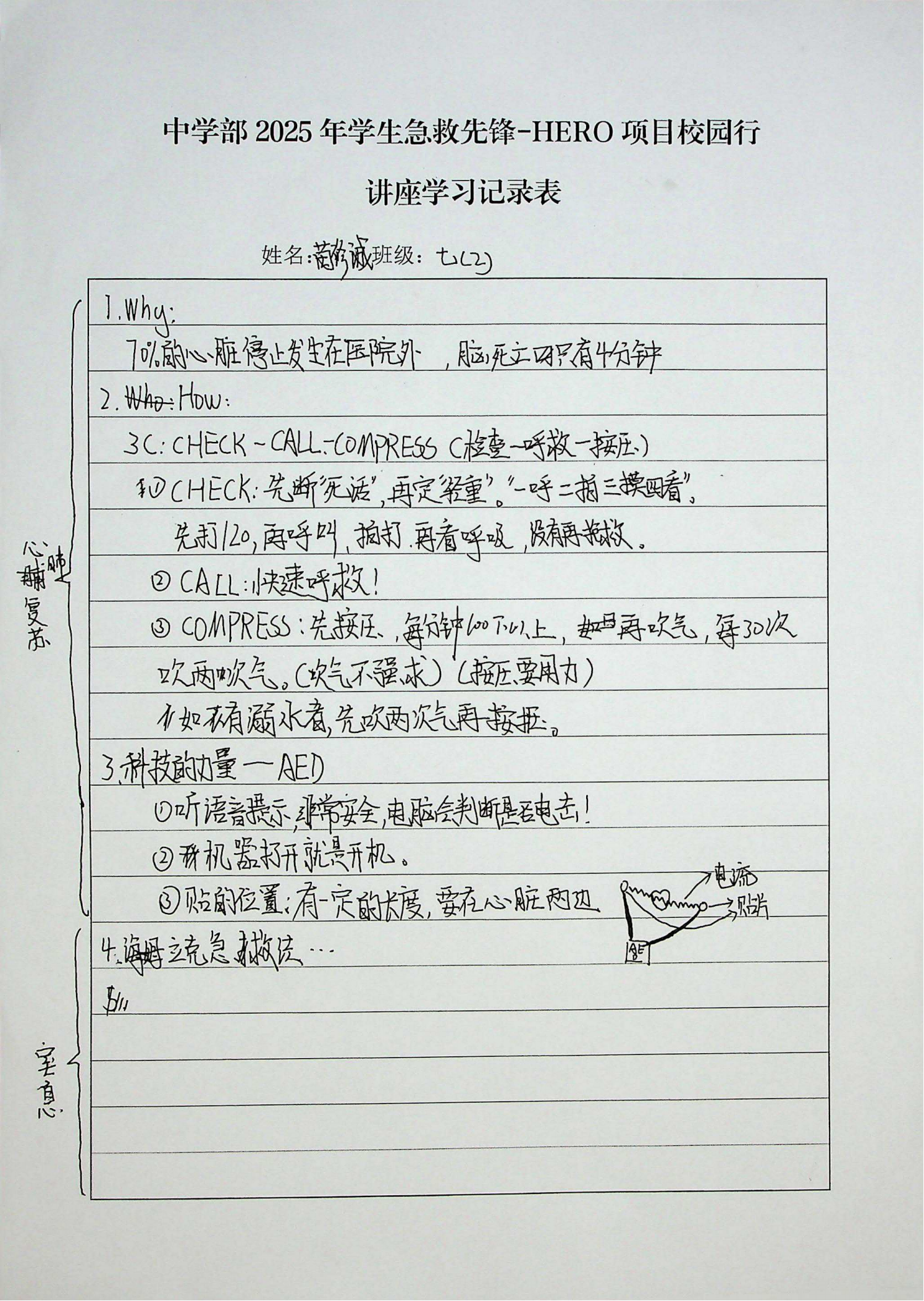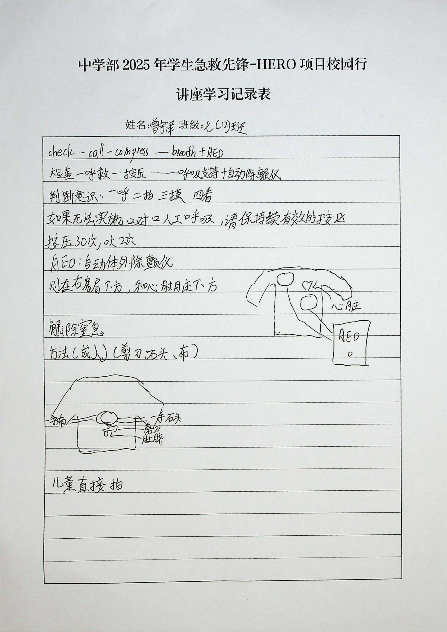 实操演示是本次活动的重点环节。项主任利用道具模拟,现场展示了心肺复苏等急救技能的规范操作流程。从胸外按压的位置、频率和深度,到人工呼吸的正确方法,每一个细节都进行了细致的讲解和示范。同学们聚精会神地观看,并在学习记录单上记录关键要点。