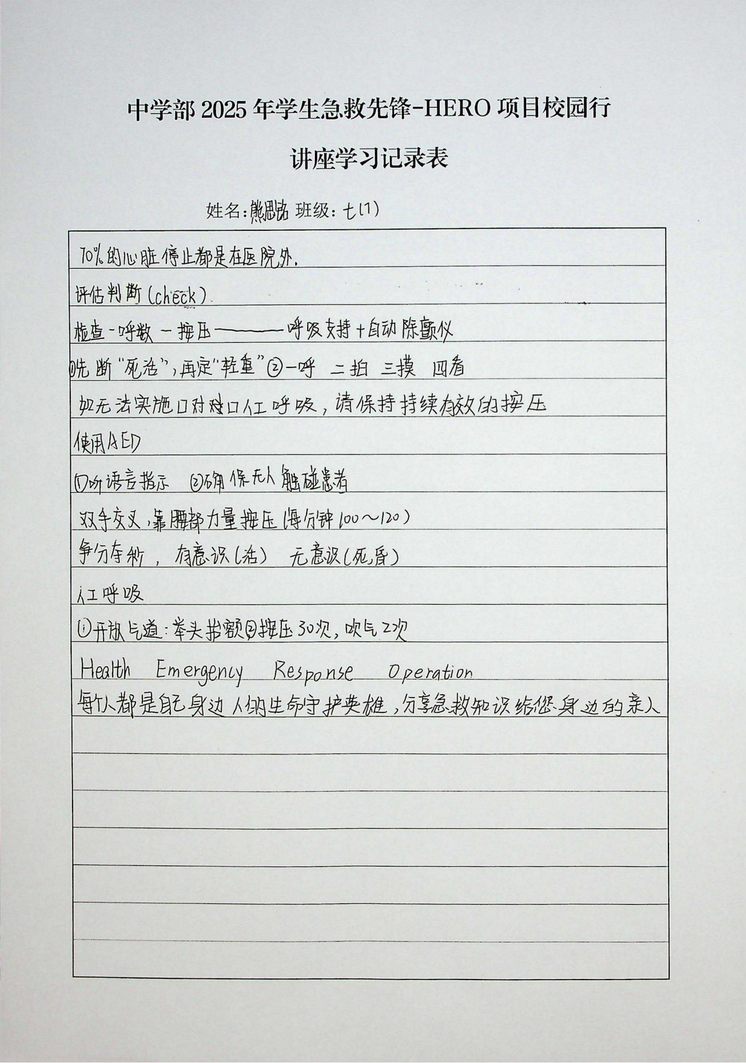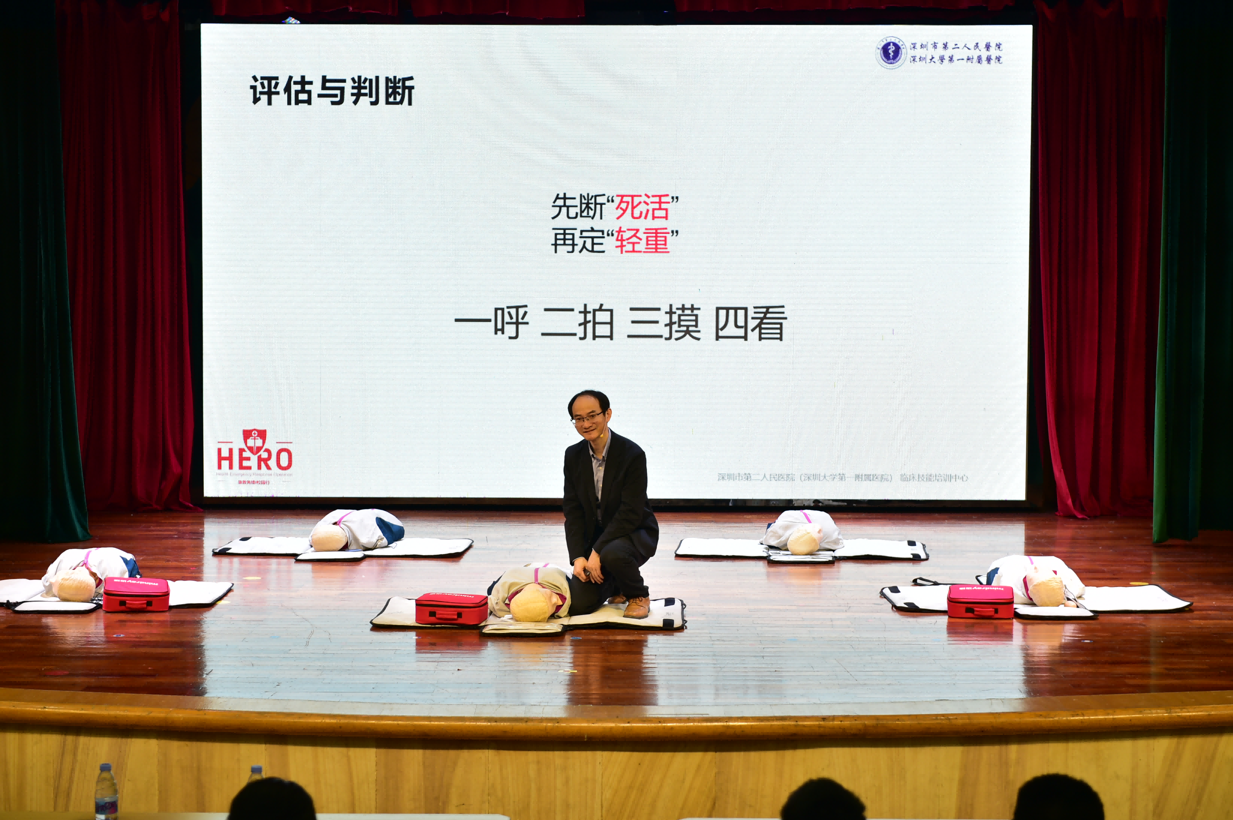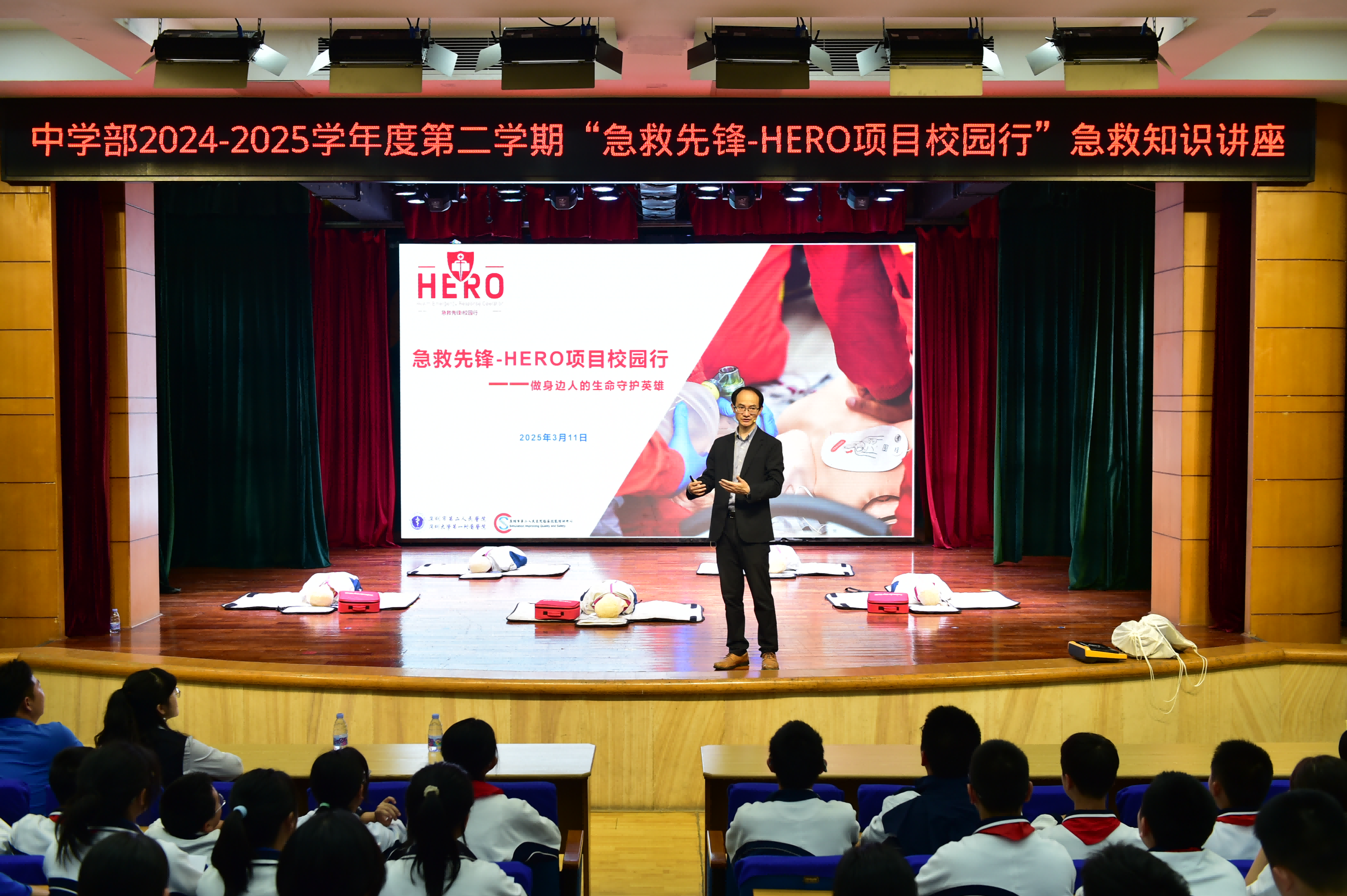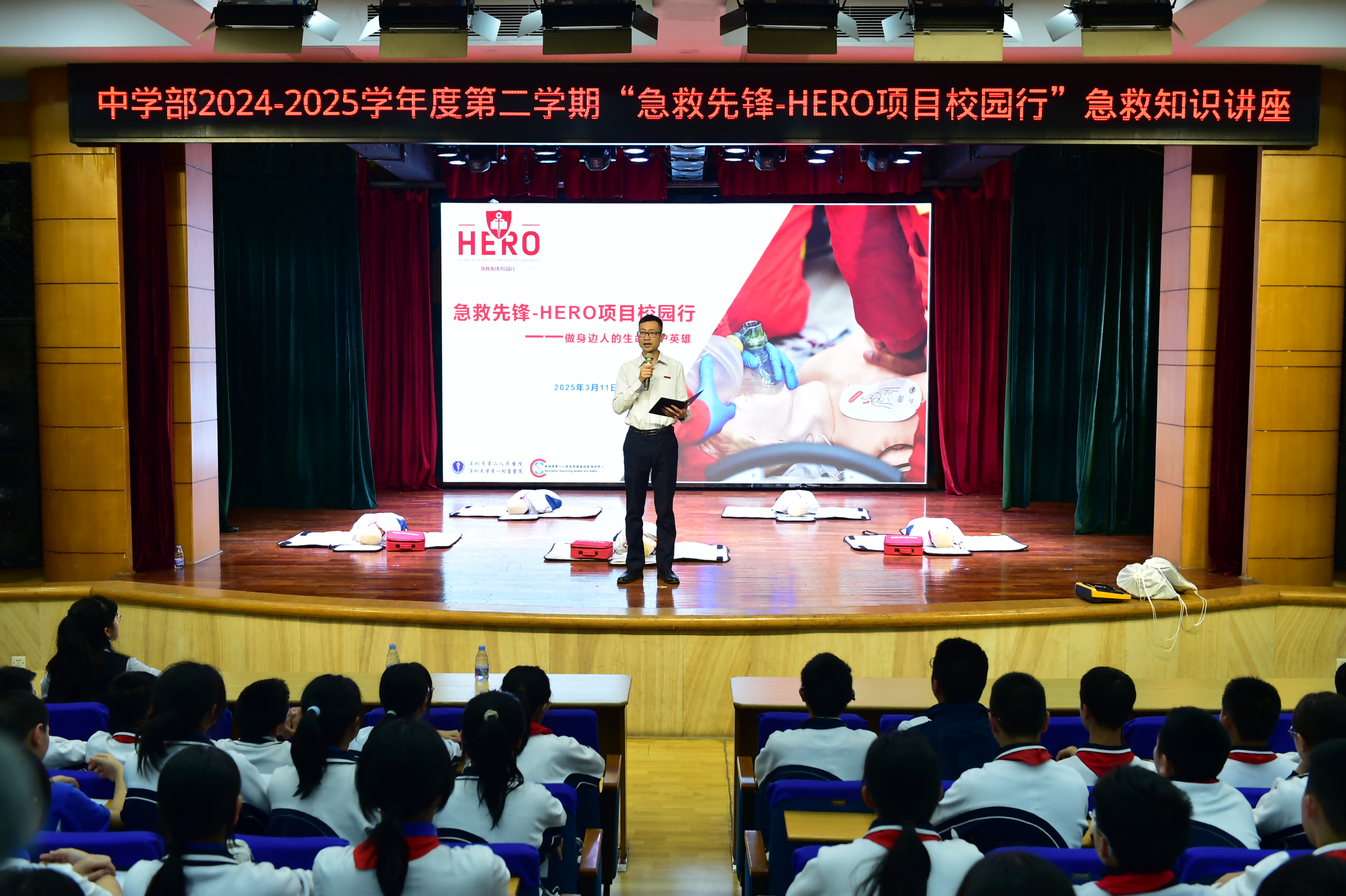 为加强学生急救知识和技能,筑牢校园生命防线,3月11日,中学部邀请了深圳市第二人民医院(深圳大学第一附属医院)主任医师、技能中心项明方主任,为七年级师生带来了“急救先锋——HERO项目校园行”急救知识讲座。