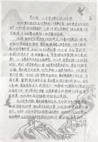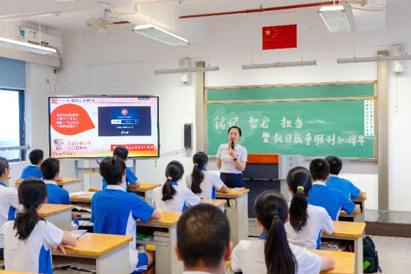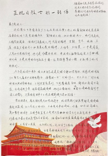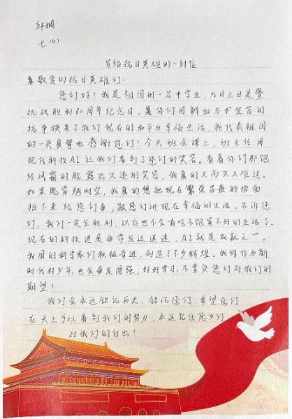 在班会课上,七年级每位同学怀着崇敬之情,给抗日英雄写下感情真挚的信件,表达对英雄们的深切缅怀和崇高敬意;八年级同学以班级为单位,完成抗日英雄人物小传的撰写;九年级同学举行了紧张激烈的“抗日战争”知识挑战赛。
