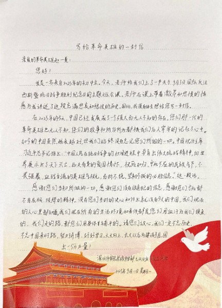 9月3日9时,中学部全体师生通过转播全程观看纪念活动直播,同学们深受鼓舞,挥笔写下感想,立志铭记历史,奋发图强。