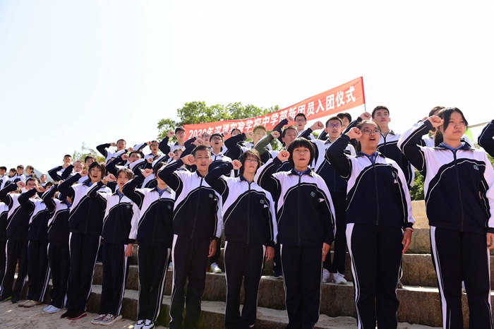 行军伊始,同学们一路欢歌。天蓝如镜,道路两侧红绿掩映,如入画中。随着紧凑的行军节奏,同学们步履匆匆,负重前行,坚决不掉队。历经十多千米的跋涉,师生们一行于12点左右到达了杨梅坑稍作休整。学生处和团委在此举行初三年级新团员的入团仪式,学生处杨宁主任和高丽主任为新团员颁发团徽,新团员代表高举右拳,庄严宣誓。胸前的团徽熠熠闪光,她将点燃青春,并激励同学们积极进取,砥砺前行。