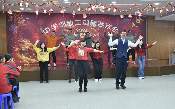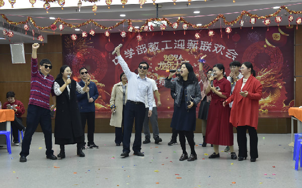 19点左右,全体教职工欢聚一堂,在西楼多功能厅隆重举行了迎新联欢会。晚会在主持人黄奕彤、范佳两位青年教师的激情开场中拉开了帷幕。随后,各个部门的教工轮番上演精心筹备的节目,为在座观众送上新春祝福。晚会过程中还穿插了趣味游戏,教工们热情高涨,积极参与,全体教工“玩”得尽兴,看得过瘾,也在忙碌的工作之余释放了压力,展现出青春昂扬的风采。