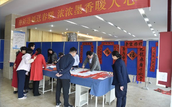同一时间,退休教师李爱华受邀和美术教师高同宇一起挥毫泼墨,为教职工送福送春联,现场气氛热烈,供不应求。