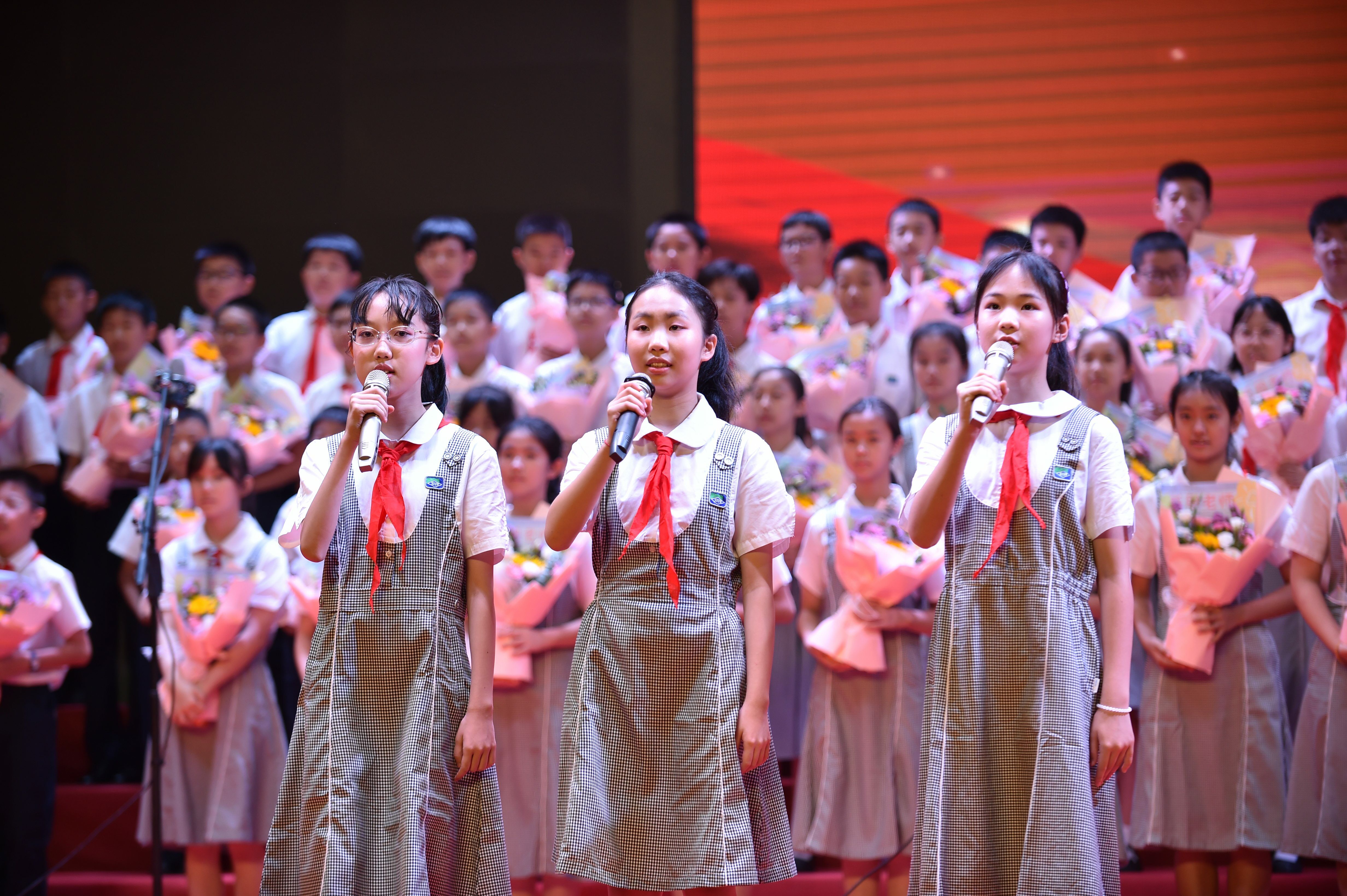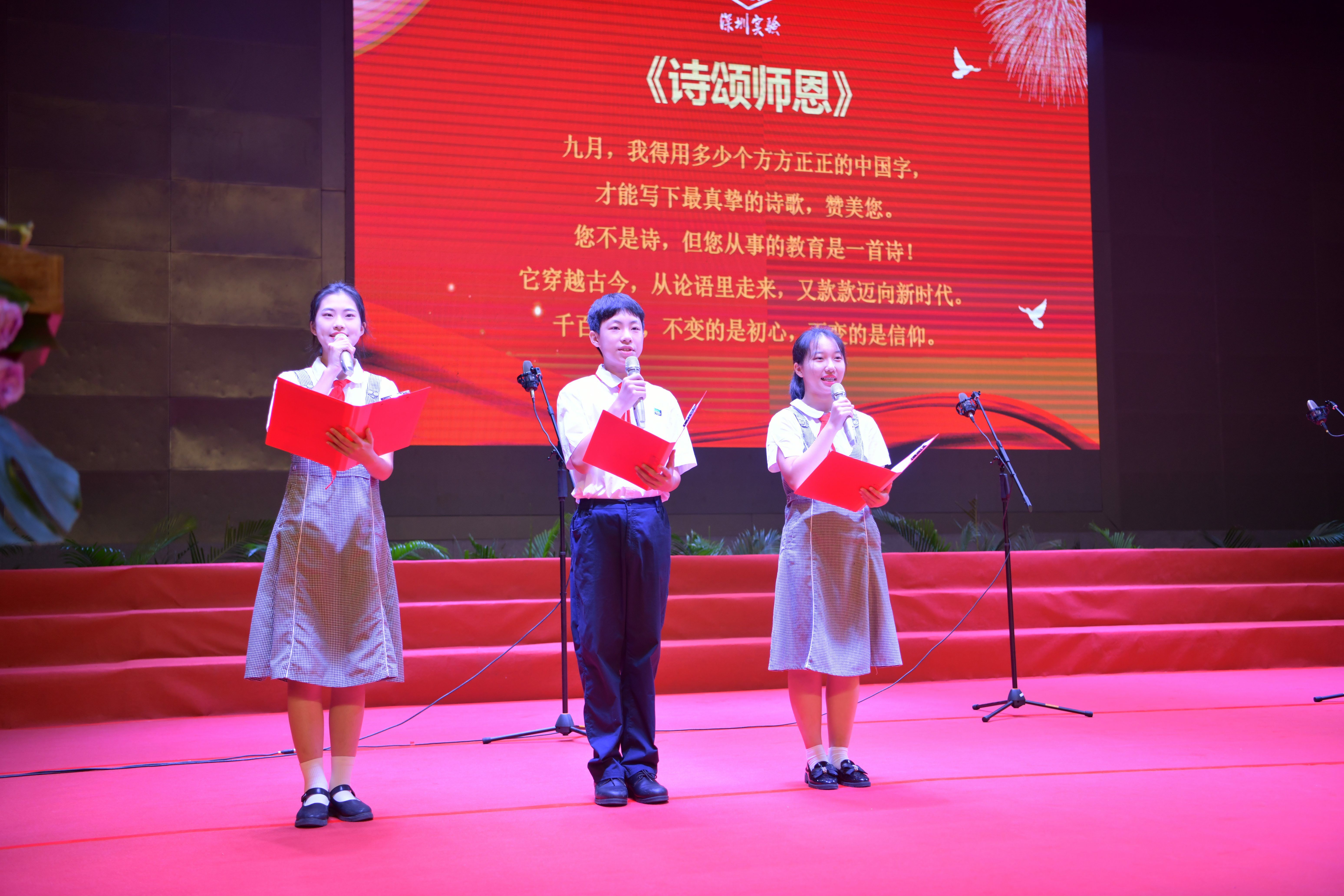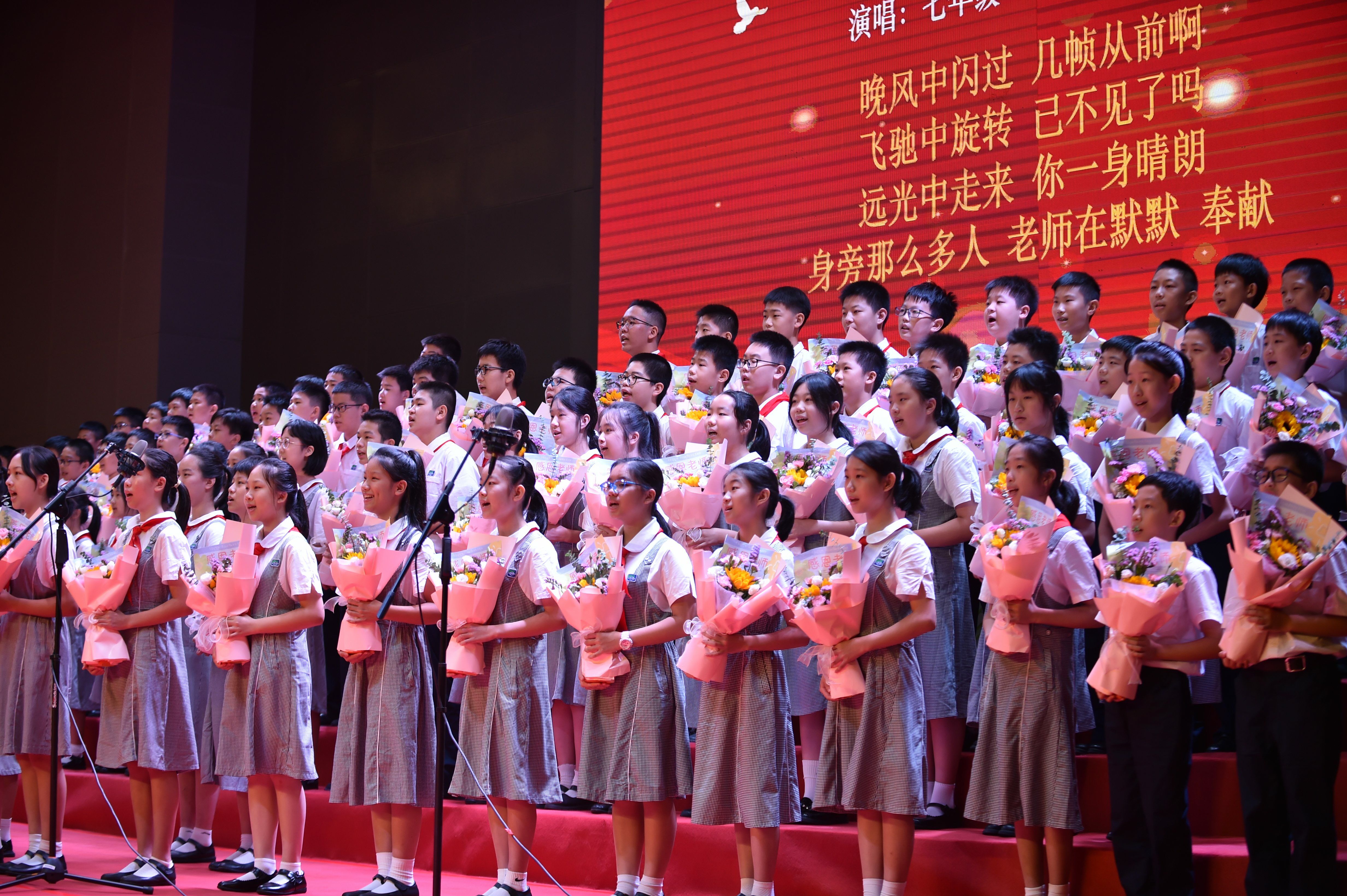 校友团成员和少先队员代表手捧鲜花向老师献上祝福,朵朵鲜花代表着对老师的爱戴和节日的慰问。最后,全体师生共同唱响实验校歌,大会在喜庆热烈的氛围中落下帷幕。