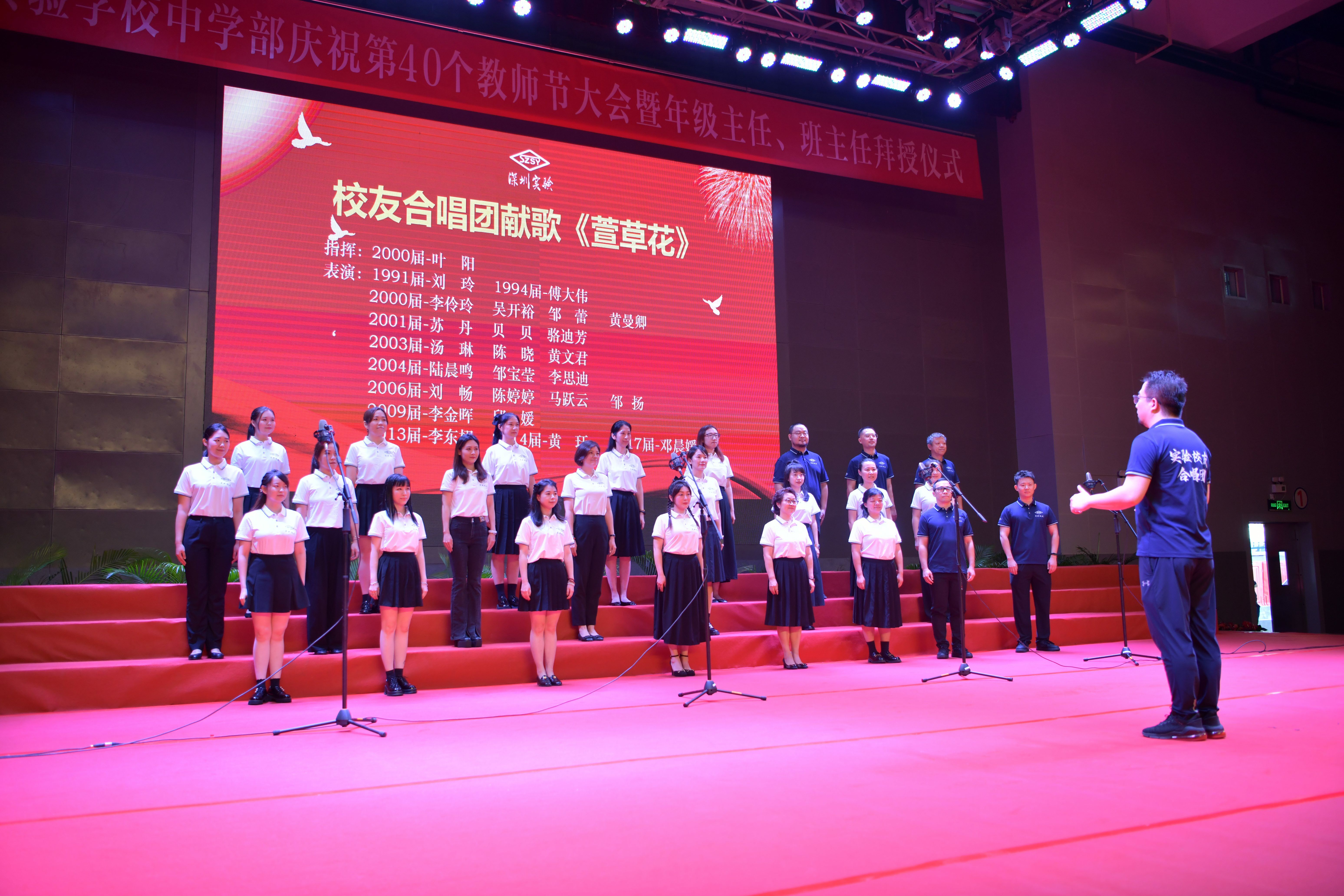 实验校友合唱团的成员们也来到了仪式现场,他们是实验学校历届优秀毕业生的代表。长期以来,他们一直关注并支持着母校的发展,引领尊师重教在校友群体蔚然成风。校友合唱团深情献唱《萱草花》,表达了他们对母校和老师的深深眷恋。三个年级的学生代表们精彩演绎的《诗颂师恩》、大合唱《这世界有那么多人》,更是增强了师生之间的情感联系。