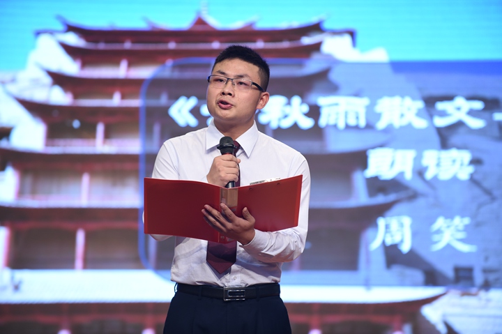 接下来,《余秋雨散文》的朗读与分享。首先,周笑老师朗读了《莫高窟》选段,带领观众走进敦煌,仿若眼前浮现了一幅幅精美绝伦的壁画,一尊尊风格迥异的雕塑,让观众为中华灿烂文化自豪的同时,更为痛失大量传世经书感到痛心。紧接着王特老师与大家分享余秋雨的《田园何处》,让观众体会享受到陶渊明之田园、余秋雨之安逸,也体味到“纵浪大化中,不喜亦不惧”的那份安定与从容。两位老师朗读结束后,曹李勇老师与大家分享《余秋雨散文》的读后感,他针对城市与人的关系进行了深入切实的思考,用自己的切身体会细谈了人与城市的那份特殊感情和纽带,呼吁观众们用心融入所在的城市,并带着骄傲与自豪努力去成为这个城市闪亮的名片。