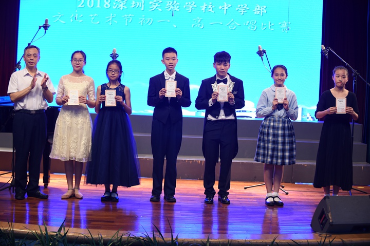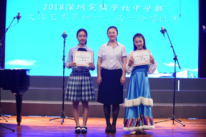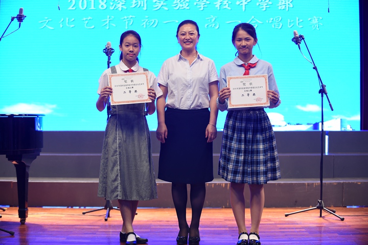 合唱比赛活动以初一(2)班学生们的凯旋演唱收尾。作为在2017年深圳市中小学艺术展演活动——班级合唱比赛中一路过关斩将、赢得优秀展演奖和最佳创意奖两项殊荣的团体,初一(2)班同学们踌躇满志,气势高昂,为此次合唱比赛带来参赛曲目《眺望你的路途》和实验校歌《实验之路春常在》,精彩的演唱、深情的朗诵和生动的表演将现场气氛推至巅峰。