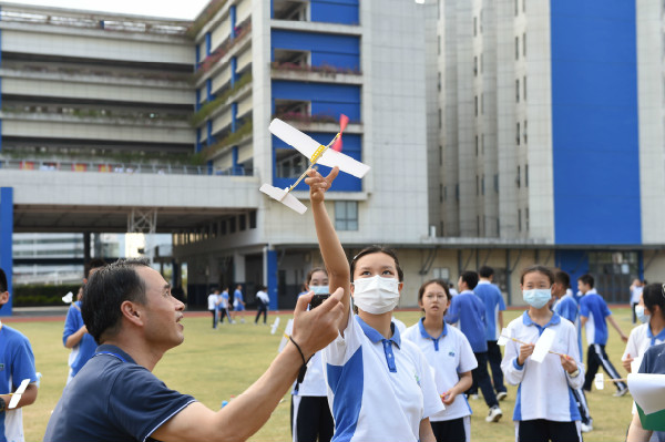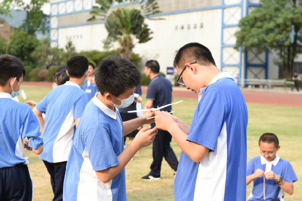 绿草如茵的足球场上,初一年级参加“飞向天空”比赛的同学在划分好的比赛区域按班级就坐。天清气朗,选手们早已准备就绪,蓄势待发。有的选手还在利用候场时间不断调试自己的“飞机”,将飞机上的橡皮筋缠绕数回,为自己的飞机加足马力,以求自己的飞机能在空中停留尽可能多的时间。随着一声令下,一架架飞机在绿茵场上空中划过一道道优美的弧线。