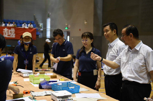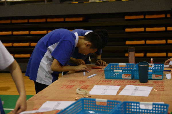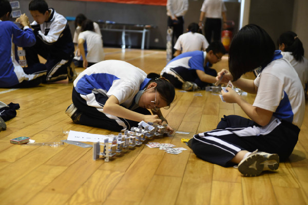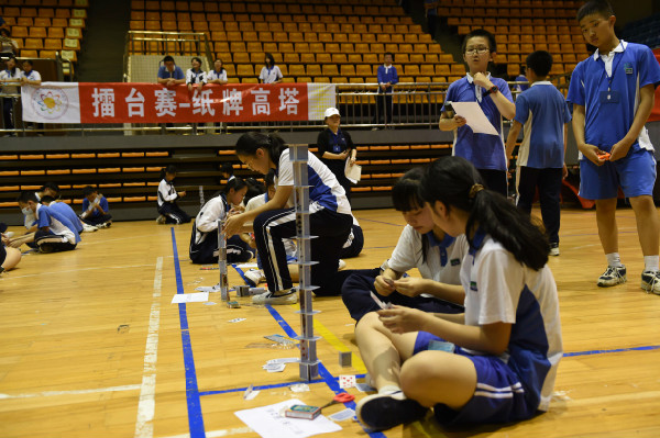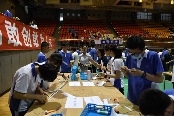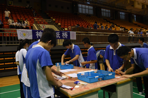 文体馆里,初一、初二年级的同学进行了“纸桥承重”和“纸牌高塔”两项比赛。进门靠右侧的区域,同学们进行“纸牌高塔”的比赛。比赛伊始,各班选手迅速分工,一人灵巧地裁剪着纸牌,另一人小心翼翼的拼装。随着纸牌塔越堆越高,选手们屏气凝神,动作更轻柔了,生怕碰倒自己倾力打造的作品。整个过程既考验同学们的合作,更考验默契。文体馆的另一侧是“纸桥承重”比赛。同学们必须当场在规定时间内完成纸桥的制作,并在上面放置砝码进行测试。测试前,各班选手精心设计,并在桌上利用打印纸等材料制作,不一会儿就完成了各具特色的纸桥。砝码放置测试是最激动人心的时刻,两位选手目不转睛地盯着纸桥,生怕错过纸桥的任何一点变化。纸桥的跨度不断拉长,选手和观众的心弦却不断收紧,担心沉重的砝码会压塌那纸桥。