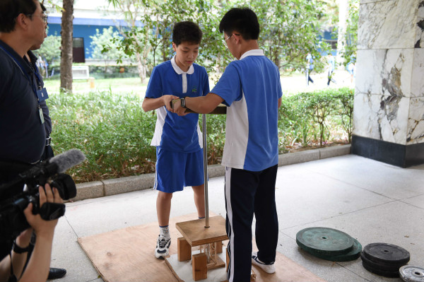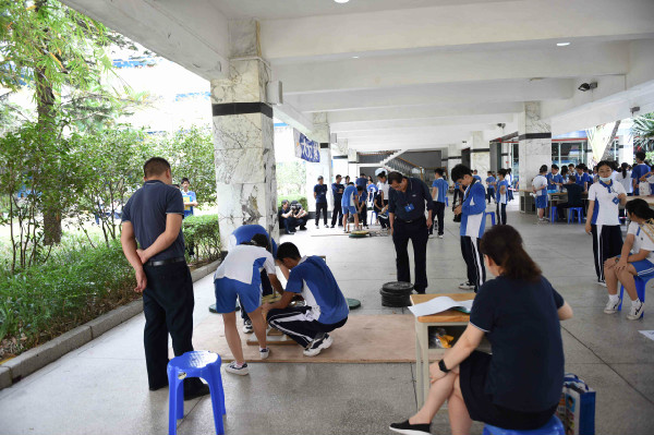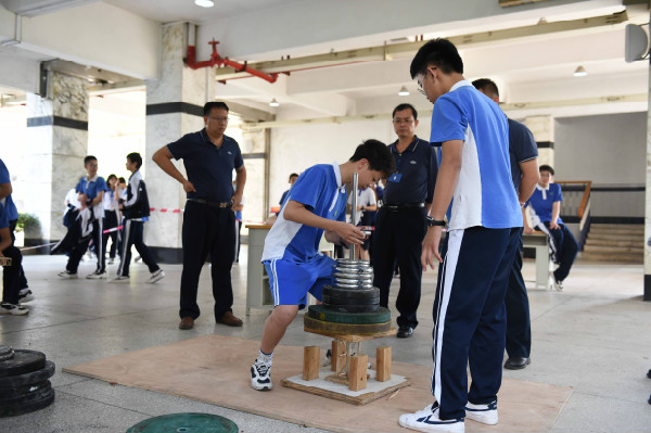 在中学部一楼中厅进行的是初二年级“大力神”比赛。赛前,同学们反复琢磨,用心设计,用一根根小木条制作成集美学和力量于一身的木框架结构。哪组同学的框架结构设计最合理,能承载最大的重量呢?同学们手中的框架结构俨然成了“大力神”,即将接受承重测试。比赛中,同学们小心翼翼地将一个个不同重量的砝码叠放在“大力神”上,场上所有人的目光也都聚焦在“大力神”上。当“大力神”坍塌的那一刻也是其承重极限,也是其最高光的时刻,同学们为之欢呼和鼓掌。在学习生活中,我们也应该像“大力神”一样,突破自己,以求多承载一份重量。