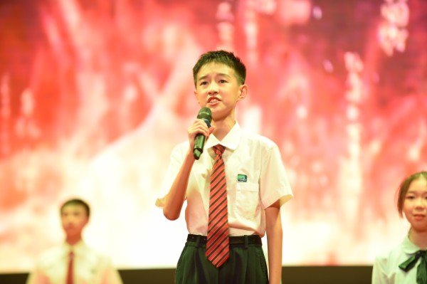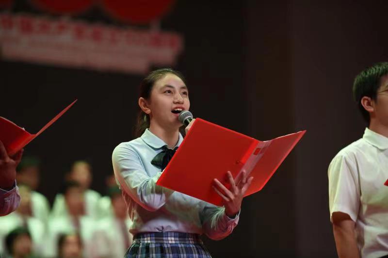每当唱响红歌,总能唤起我们对中国共产党辉煌历史的回忆和景仰。教师代表唐尧、高同宇、陈树蕾、赵丽媛以及学生代表初一(5)班尹若希、初一(10)班周子媛表演的大联唱《我爱五指山我爱万泉河》《南泥湾》《万马奔腾保边疆》《映山红》《我的祖国》激情高昂,催人奋进。杨几源 、段凯怀、王浚源、韩宏泽、刘文捷等同学合唱歌曲《少年中国说》,将少年志,中国梦时刻铭记在心。舞蹈《扬帆起航》,通过唯美的舞台效果和优雅舒展的肢体语言,传递和表达了一百年来,多少暗礁险滩,多少风浪搏击,让我们看到胜利就在前方。由初二年级学生代表带来的歌舞表演《奔跑的青春》,表现出青年的奋进、英姿勃发。初二7、8班同学的诗歌朗诵《曙光》,传递出镰刀铁锤锻造的坚定信仰。初一年级师生演唱的歌曲《在灿烂阳光下》,表达了新时代,新征程的决心和使命。
