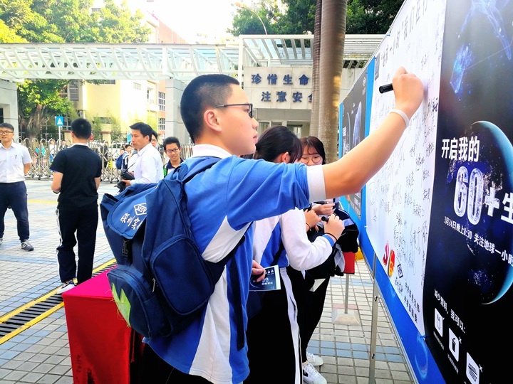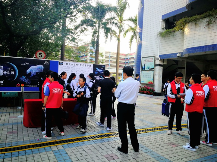 团委、学生会的成员身穿义工服以及“地球一小时”活动服装,向师生、家长宣传、传递着环保理念。中学部党员老师积极参与此次活动,并在签名版上写下自己的姓名和愿望,表达参与维护地球行动的意愿。中学部党员刘春风老师现场向学生讲解宣传“地球一小时”活动的意义,倡导爱护环境、绿色出行的理念;学生及在场的家长也积极参与,为环保贡献一份力量。现场气氛热烈,环保理念在布满签名的板上体现得淋漓尽致,每一个签名都代表着师生、家长对地球-——我们的家园的关心与呵护。