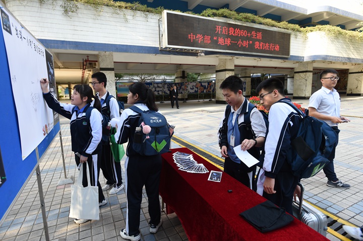 为响应保护地球环境、建设美丽家园的全球倡议,3月23日下午,由中学部党支部和团委学生会联合举办的“2018地球一小时”环保签名活动在东楼一楼前厅举行,活动旨在发起绿色生活的环保倡议,号召全校师生参与一小时,超越1小时,为蓝天做出实际的环保转变。