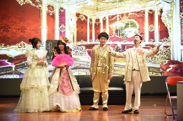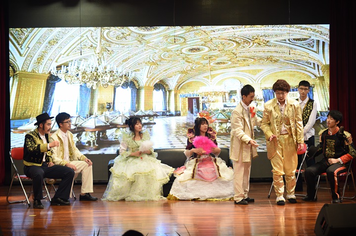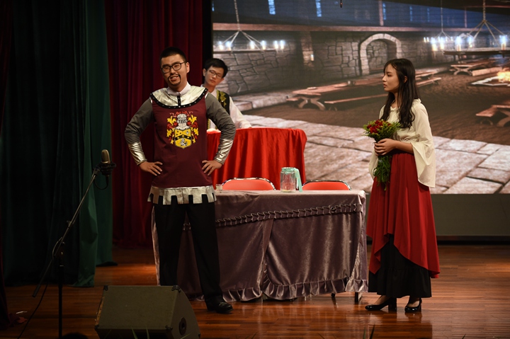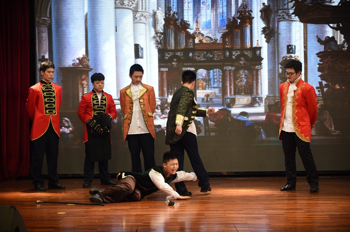 开场戏,是高二(3)班带来的俄国讽刺作家果戈里的代表作《钦差大臣》。演员们身着华丽的中世纪服装,用夸张的面部表情和略带诙谐的念白为我们生动地再现了19世纪俄国达官显贵们的丑恶形象。主演颇具感染力的台词、一言一行表现出的敏锐、机智,让观众拍手叫好。