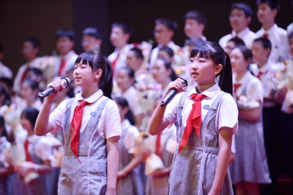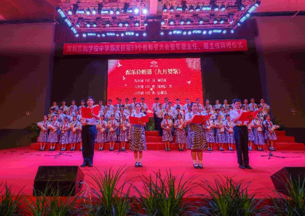 一朝沐杏雨,一生念师恩。拜授仪式后,由八年级和九年级学生代表为老师们献上诗歌朗诵《九月赞歌》,由七年级1班和2班学生为老师们带来歌曲《所以少年人》。全场在激昂的诵读声和舒缓的歌唱声中汇成了感恩的暖流。在此刻全场氛围达到顶点时,每位老师也接受到了学生代表的献花。花香飘溢,师恩永存。活动最后在全场对实验校歌的整齐合唱中结束。
