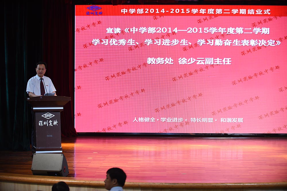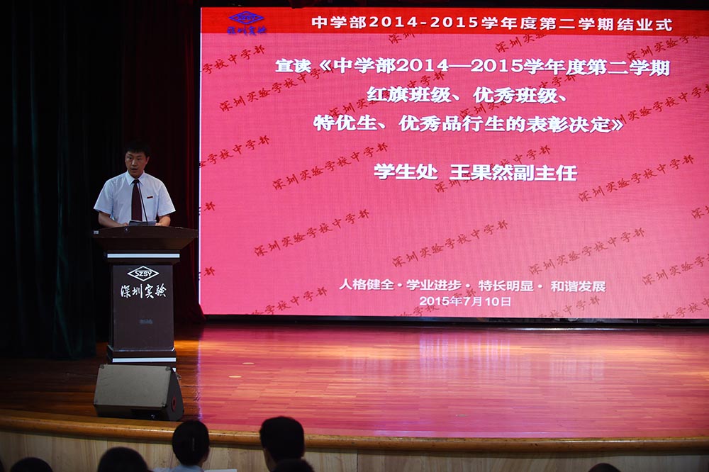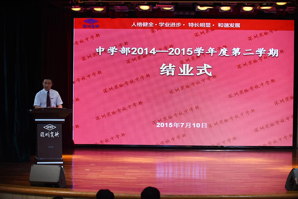 7月10日,中学部中学部全体教师及非毕业班的同学们齐聚五楼小礼堂,举行2014—2015学年度第二学期结业式,共同回顾这一学期的学习和工作,同时也为即将到来的暑假生活给同学们提供一些指导。大会由学生处副主任杨宁主持。