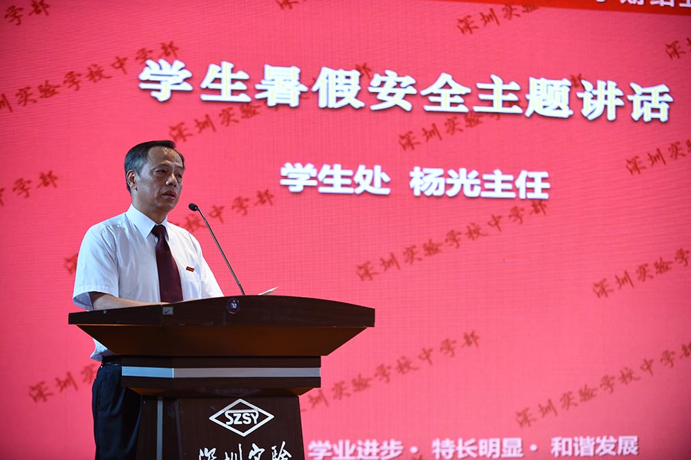 最后,学生处杨光主任就暑假学生安全生活做了详实而贴心的指导讲话。向全体学生提出要求,特别强调安全第一;同时为同学们如果度过一个有意义、有收获的假期生活做了指导。