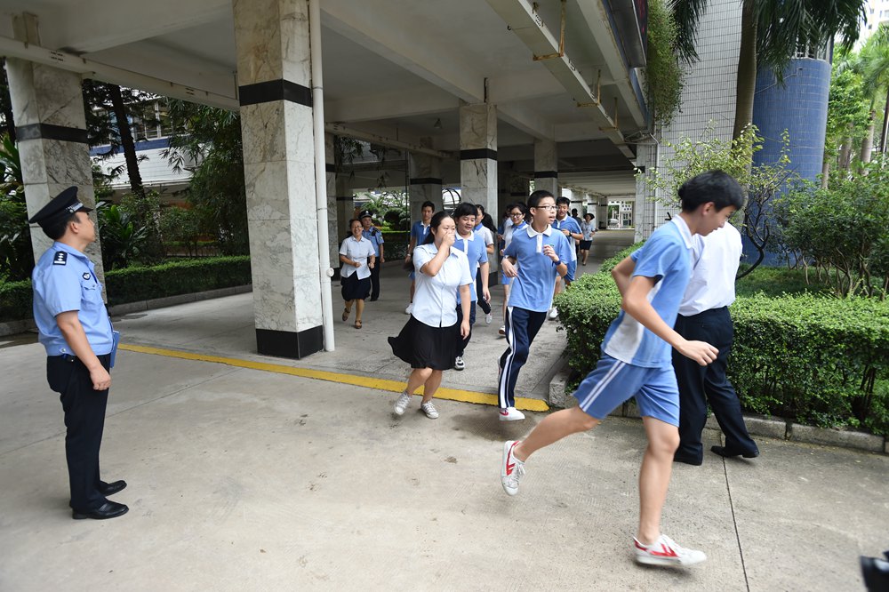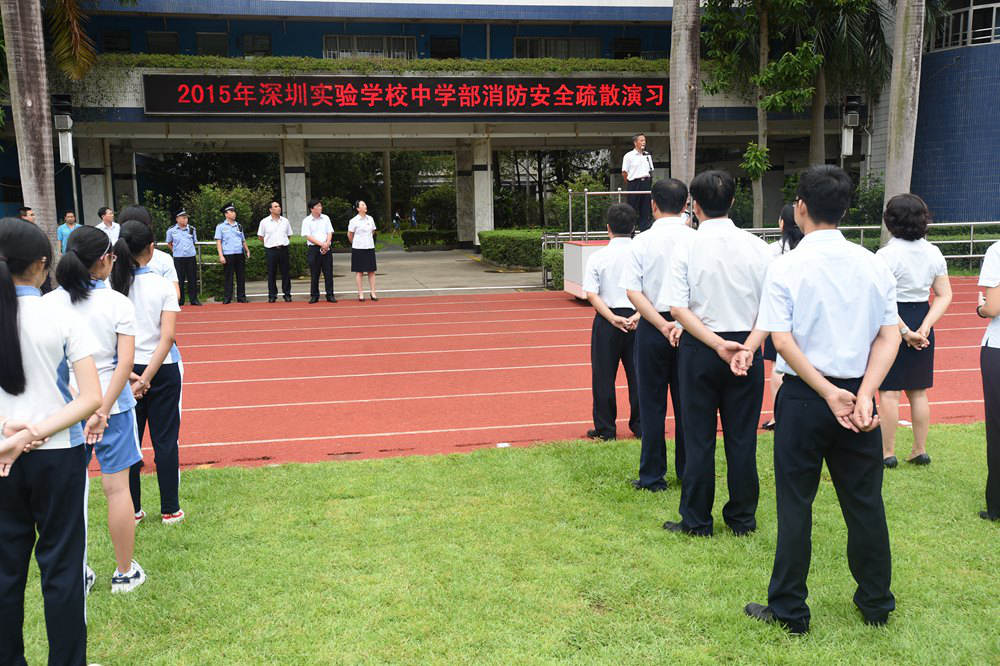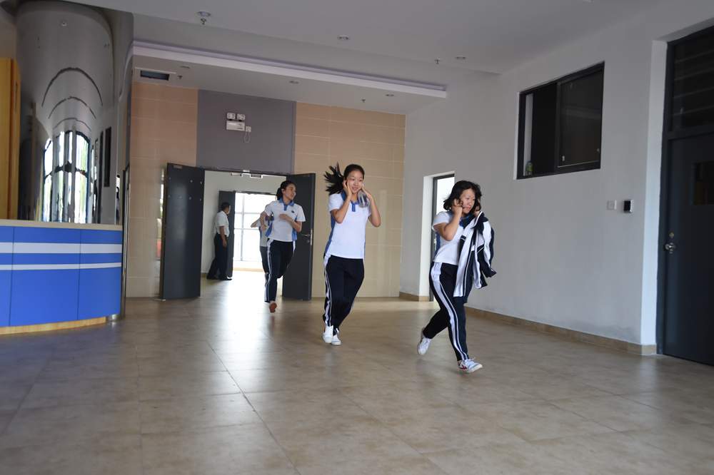当天下午,一阵急促的警报声拉开了中学部师生安全疏散演习,听到警报声各位老师立即到达指定楼层和通道,指导学生快速疏散,各班班主任带领学生弯着腰、捂住口鼻,沿着学校制定楼梯通道快速撤离并有序到达学校操场的安全地带,随即各班清点人数并层层向上汇报。本次安全疏散演习得到各级领导和相关部门的高度重视,园岭派出所消防专干也来到我校指导演习工作;龙萍副校长、王飞副校长以及集团相关领导也参加了本次疏散演习。