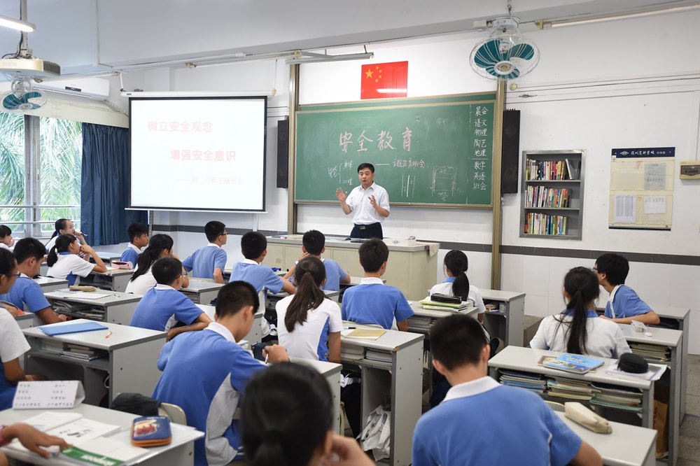 9月11日下午,高中年级学生特别进行了宿舍楼的安全疏散演习,同学们一定到警报声后,迅速、有序地下楼,收到了预期的效果。周一班会课上,全校各班积极围绕安全教育召开主题班会,班主任老师和主讲学生以近期社会上出现的安全事故为警钟,从人身安全、财产安全、网络安全、交友安全等方面向学生介绍一些基本的自我保护、自救的方法。