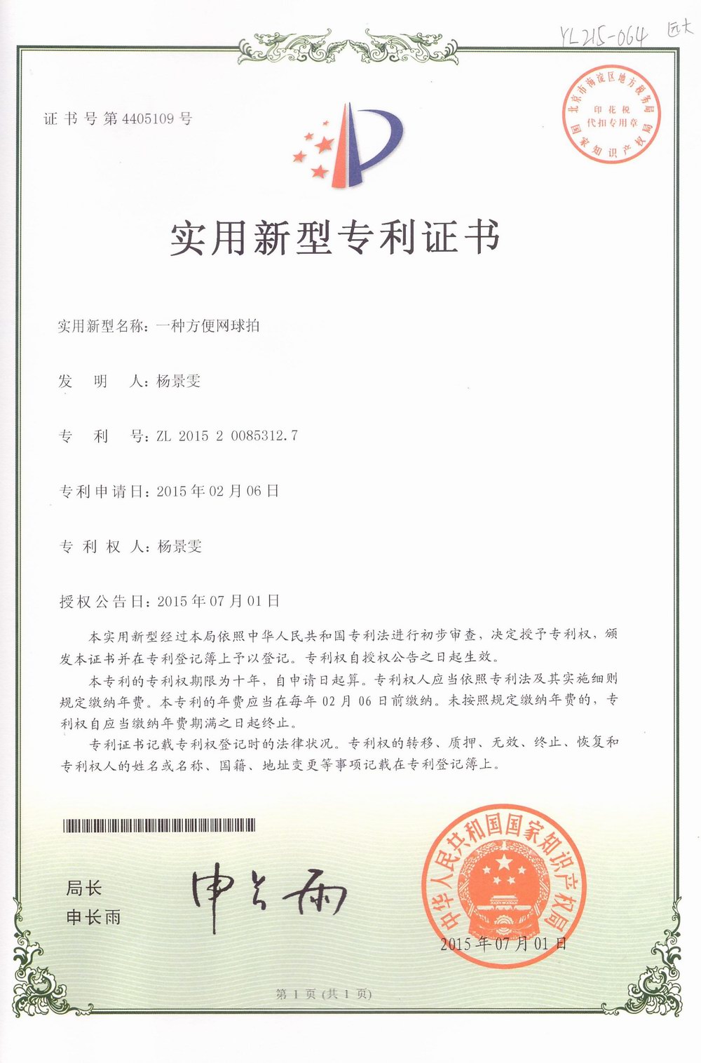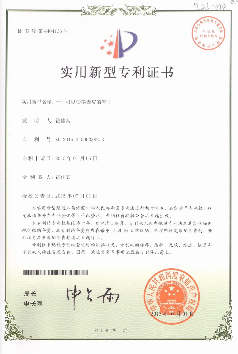 在刘绍家老师的耐心指导,这些“火花”“金点子”被不断完善,扩展升华,最后变成了操作性强、适用性好、成本低的一件件科技作品。学校推荐这些科技作品参加全国、省、市青少年科技创新大赛,并帮助申请国家专利。从去年4月开始,中学部分期分批向国家知识产权局提出70多个发明项目的专利申请。国家知识产权局专利局陆续发来的《授权通知书》,上学期共收到第一批24本《专利证书》,日前又收到国家知识产权局专利局发来的第二批18本《专利证书》。12日周一晨会上,中学部举行了证书颁发仪式,龙校长为荣获发明专利的同学颁奖。