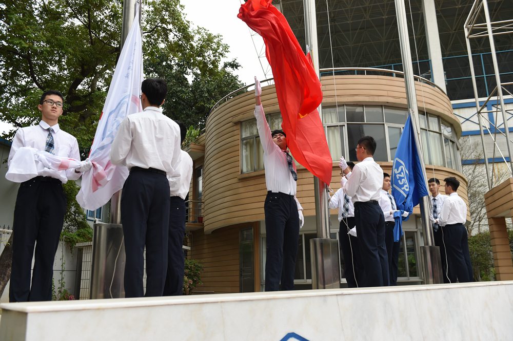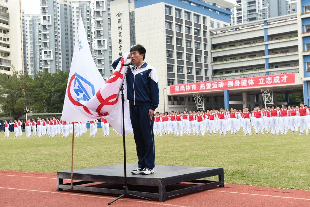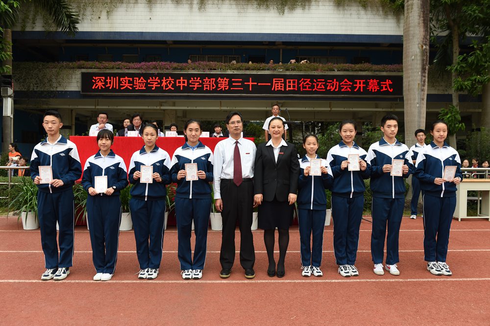 在《歌唱祖国》激昂的旋律中,由18名学生旗手高举的国旗、校旗、会旗走过主席台,他们英姿飒爽,意气风发,坚定的步伐传递出实验学子非凡的气质。升旗仪式结束后,中学部副部主任、教务处王兵主任宣读了“2015年中学部体育特长生”表彰决定,许多、吉应恒、师皓晴、夏利亚、叶俊汝、修碧滢、陈亦心、邓岂岸等八名同学获此殊荣,运动项目涉及游泳、滑冰、乒乓球、帆板、篮球、田径等。学校期望获奖同学充分发挥示范引领作用,倡导“崇尚体育,热爱运动”的校园风尚,促进学校体育教学和校园体育活动的开展,促进全体学生的自主发展、主动发展。衷校长、龙校长为获奖的同学颁奖。随后,运动员代表李佳勋同学与裁判员代表王倩老师分别进行了宣誓。