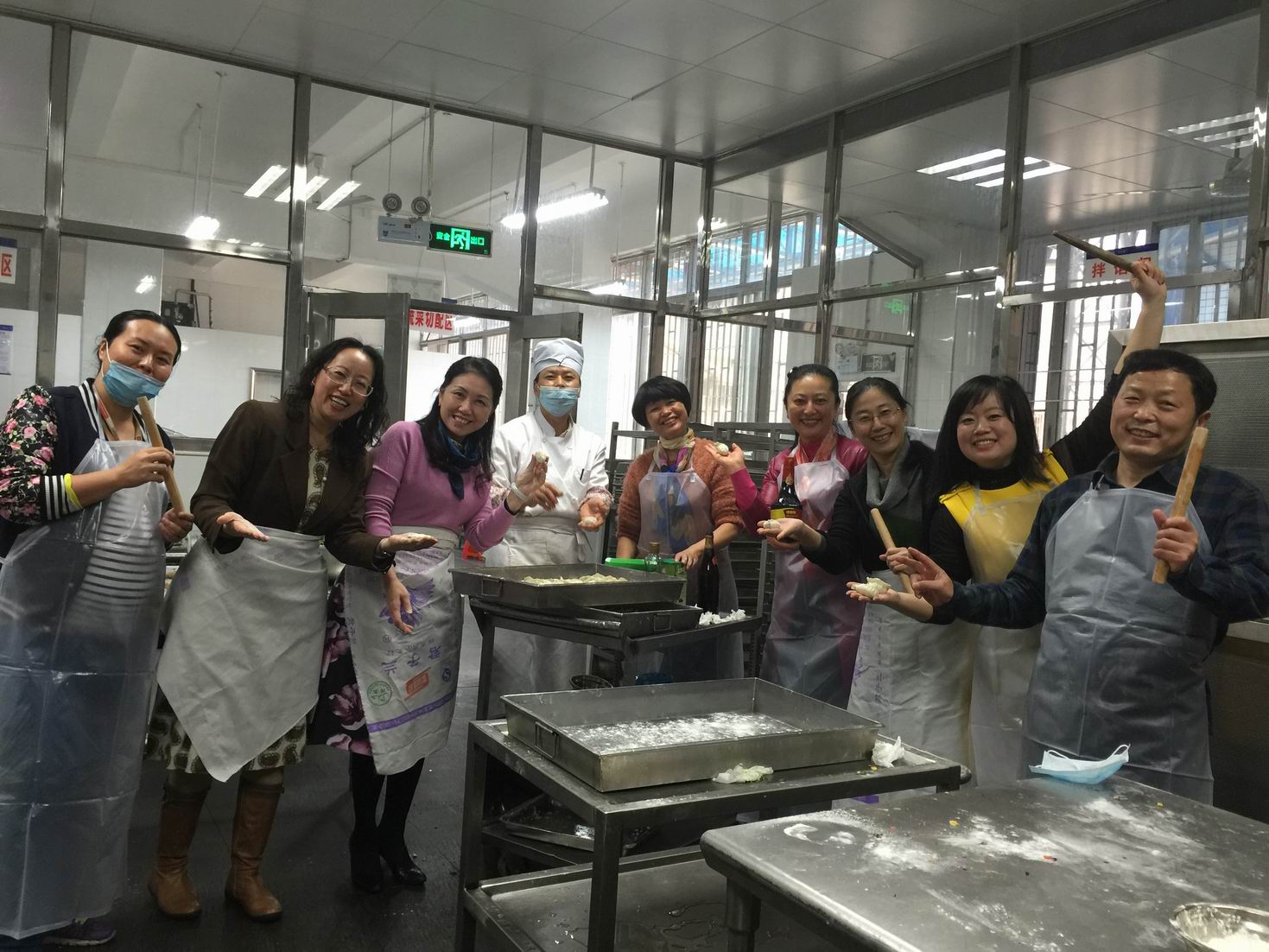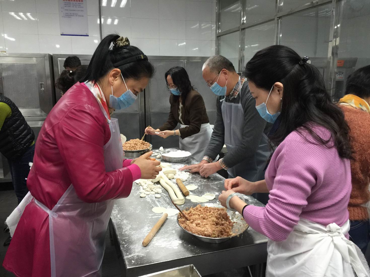 在中学部工会的精心组织和安排下,教工们来到后厨,分别选择自己的拿手活计,拌馅、擀皮、包饺子、摆盘,过程中大家互相交流饺子样式,学习新式包法,其乐融融。不一会儿各式各样的饺子就呈现在大家眼前,师傅们也忙着检查指导,很是认真。