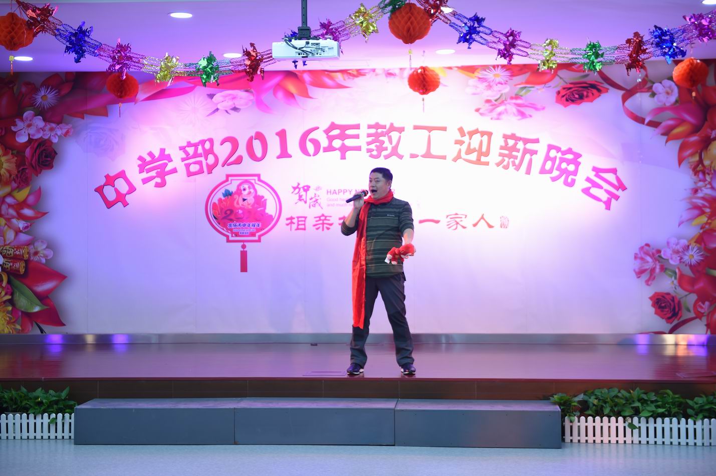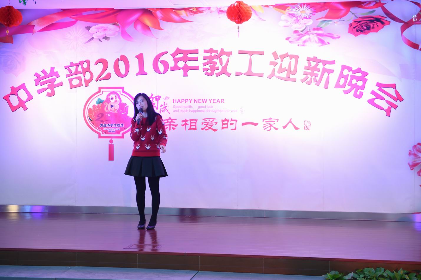 晚上6:30,教工们又来到布置温馨的西楼多功能厅参加迎新晚会。首先,龙校长致新年贺辞,她回顾了过去一年中学部教育教学等方面取得的成绩,充分肯定了2015年教工们的优秀表现,并展望了信心满满的2016年。