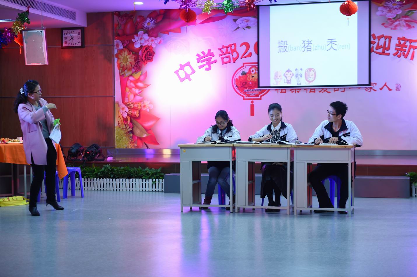 随后,教工迎新晚会正式开始,青年教师牛志强和王倩的诙谐主持加上各部门自创的精彩节目,现场气氛热闹。初二年级的《少年中国说》唱出了具有强烈进取精神的中国少年之蓬勃朝气;青年教师韵律十足的《大河之舞》跳出了青春的活力;初三年级滑稽搞笑的《芈月新传》将欢乐的气氛推向高潮;学生处专业到位的合唱《传奇》声部清晰;教务处自编自演的《三句半》道出了实验人的服务尊严;办公室总务处充满年味的二人传《小拜年》喜气洋洋;高三年级彭兰老师的《美丽心情》唱的情深意切;高一年级的情景剧《动物世界》展现了不一样的课堂;高二年级的合唱《半个月亮爬上来》娓娓动听;属相为猴的众猴们在心灵表白之后接受龙校长赠送的传统礼物;初一年级的舞蹈《燃烧吧蔬菜》激情四射。