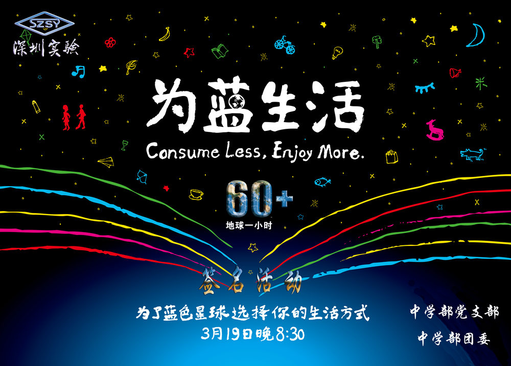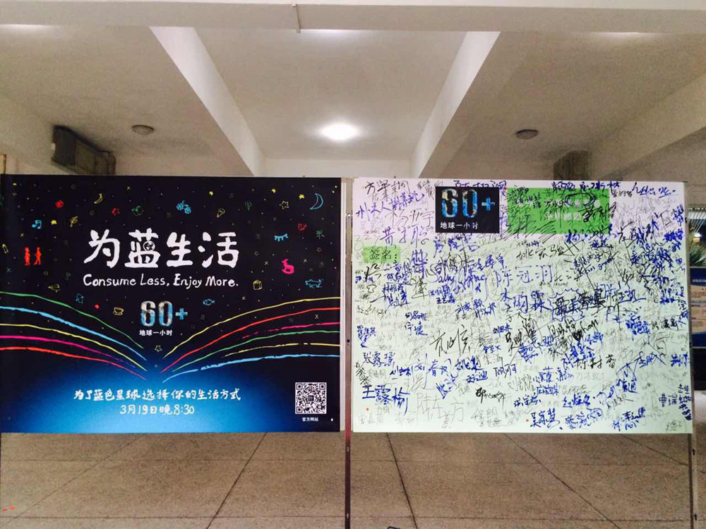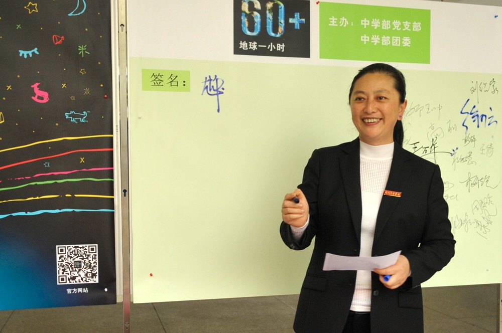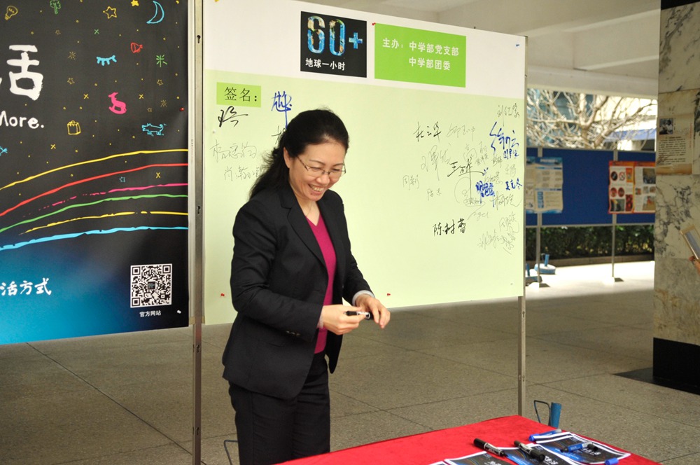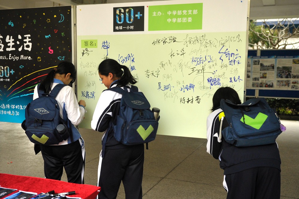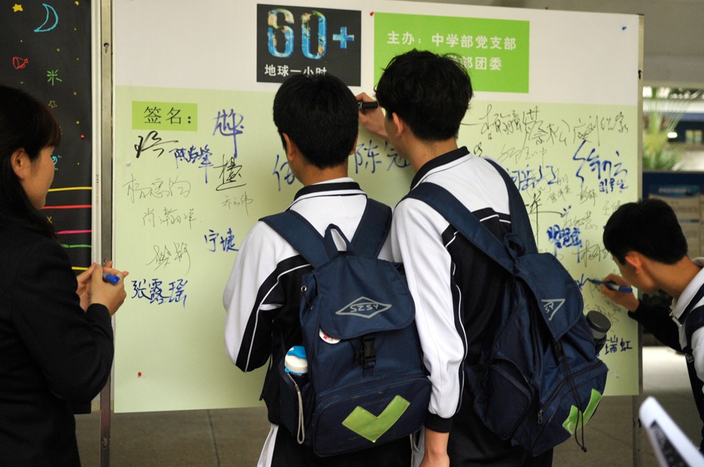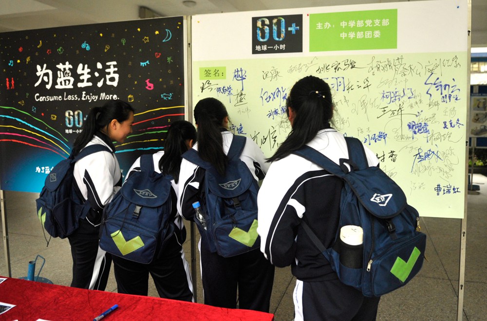 3月18日下午,中学部党支部和团委学生会学生“义心联”在东楼一楼前厅联合举办“2016地球一小时”环保签名活动,共同发起“为蓝生活”的环保倡议,号召全校师生参与一小时,超越1小时,为蓝天做出实际的环保转变。
