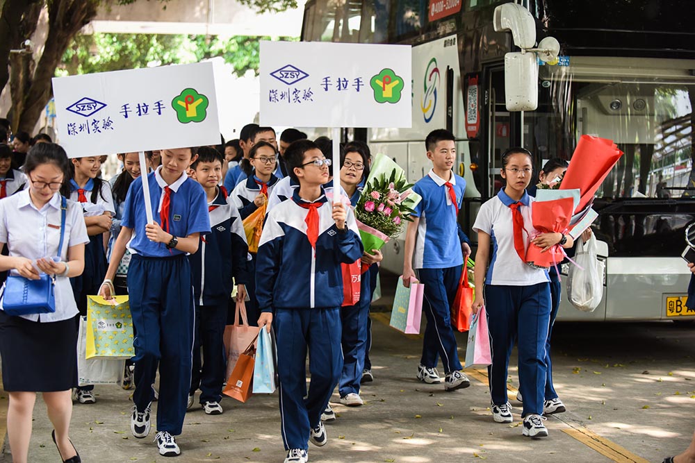 4月8日下午,我校中学部初一(6)班37名同学和部分科任老师,在班主任闫月静老师的带领下,到深圳元平特殊教育学校,与听视障部的36名初中学生开展了“手拉手”联谊活动。