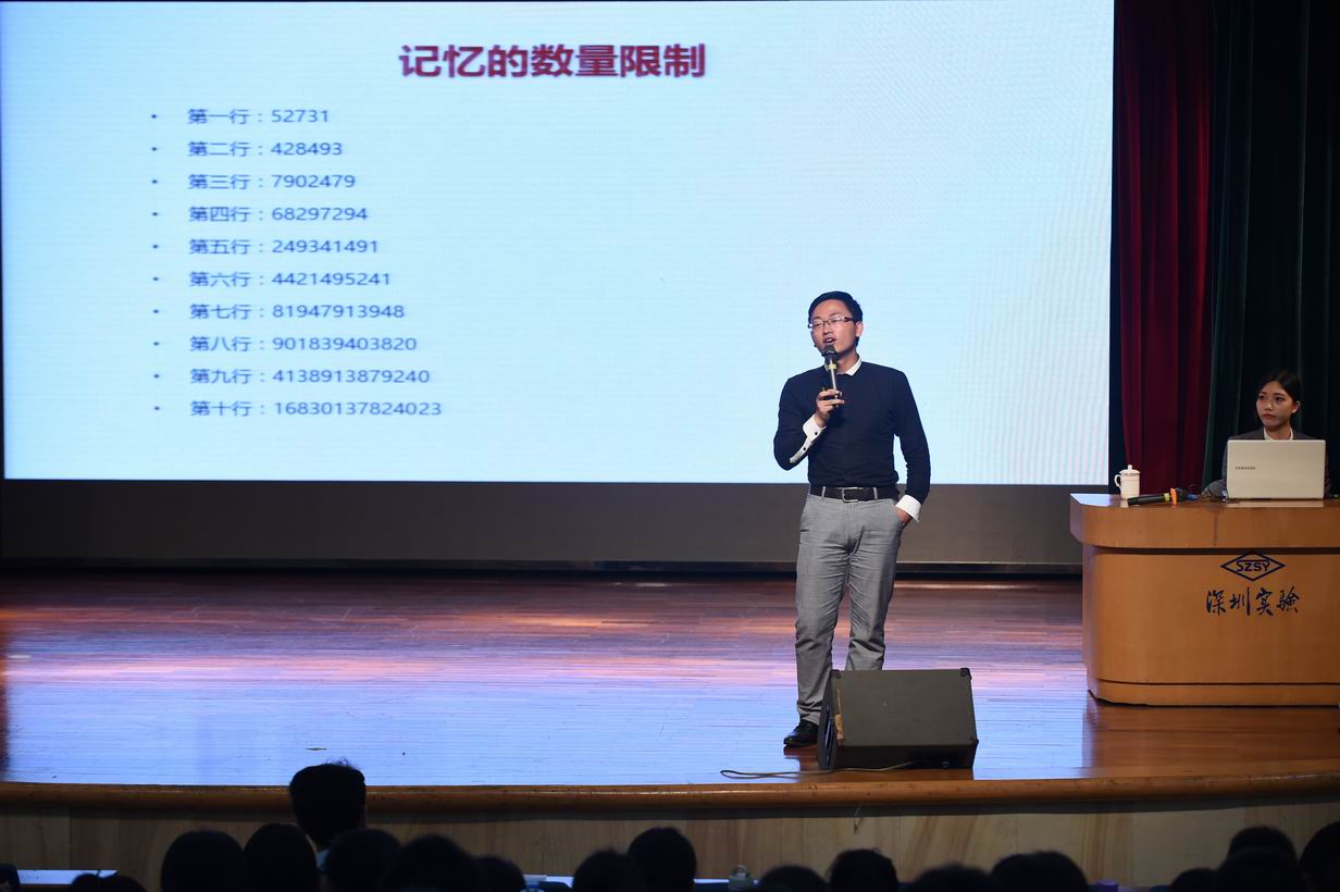5月16日下午,“中国超级大脑人才库”成员李威来中学部为同学们揭示大脑的秘密,并带领大家一起走进“记忆力”。两个多小时的讲座,他讲述了自己在学习和工作时代对记忆力的理解与实践,并以实例来展示他超凡的记忆力。最后他用生动的例子为同学们讲解促进记忆的方法。老师和同学们认真听讲,积极参与,在如何提高记忆力方面也有所收获。