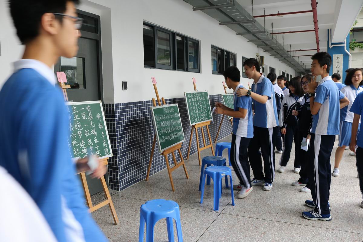 5月17日下午,高一年级举行了粉笔字大赛。各班精心挑选的参赛选手在小黑板上认真书写,一点儿也不马虎,精心到一笔一点。写好的20块黑板,令校园洋溢浓郁的书香。同学们为作品投票,选出自己心中最喜欢的粉笔字,老师们也为每块黑板上的字进行打分。这个新的尝试,极大调动了同学们对书法艺术的热情,写一手好字正在高一年级蔚然成风。(文/高一(1)班 曾晴)
