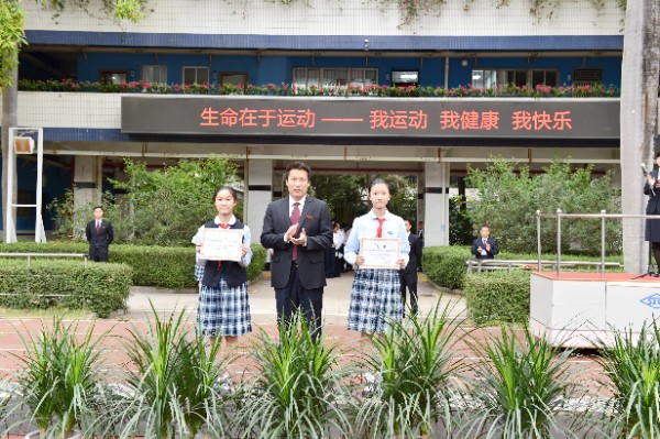 开幕式上,全体师生高唱校歌,注视校旗、会旗缓缓升起,象征着奥林匹克精神会旗在校园中迎风飘扬。随后,中学部副部主任王兵宣读了“十佳体育特长生”的表彰决定,深圳实验学校副校长、中学部执行校长龙萍一一为获奖学生颁奖。紧接着,运动员代表、裁判员代表分别进行了赛前宣誓。