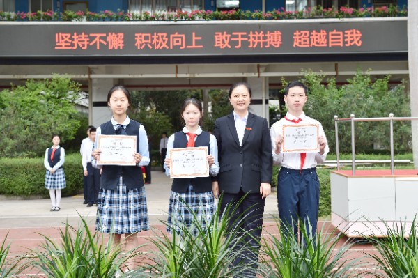 4月10日晨会时间,中学部全体师生齐聚运动场举行第三十八届田径运动会闭幕式,中学部学生处副主任熊珊主持。闭幕式上,冠军代表八年级(4)班杨子澍同学,和大家分享了他的运动感悟。随后,运动会总裁判长李文广老师宣布了竞赛总分成绩及破纪录的运动员成绩;杨宁主任宣布趣味比赛项目、体育风尚奖、优秀学生裁判员、优秀志愿者评比结果。最后,在师生的掌声中,龙校长及中学部行政干部分别为获奖集体、个人颁奖。