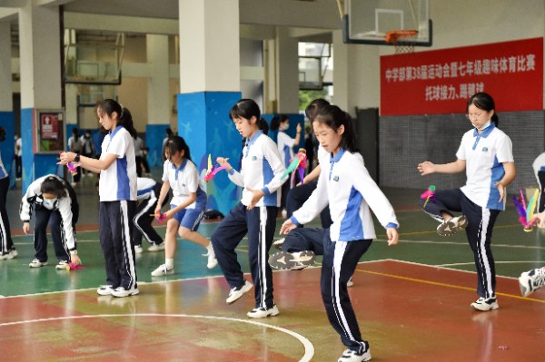 开幕式后,各年级分别进行了趣味集体比赛。七年级托球接力、踢毽球,八年级跳长绳、小布球接力,九年级拔河、夹球跑。在学校精心布置的活动中,同学们尽情感受趣味运动项目的快乐,在团队集体中充分展现自我,凝聚班级力量。