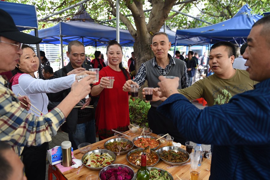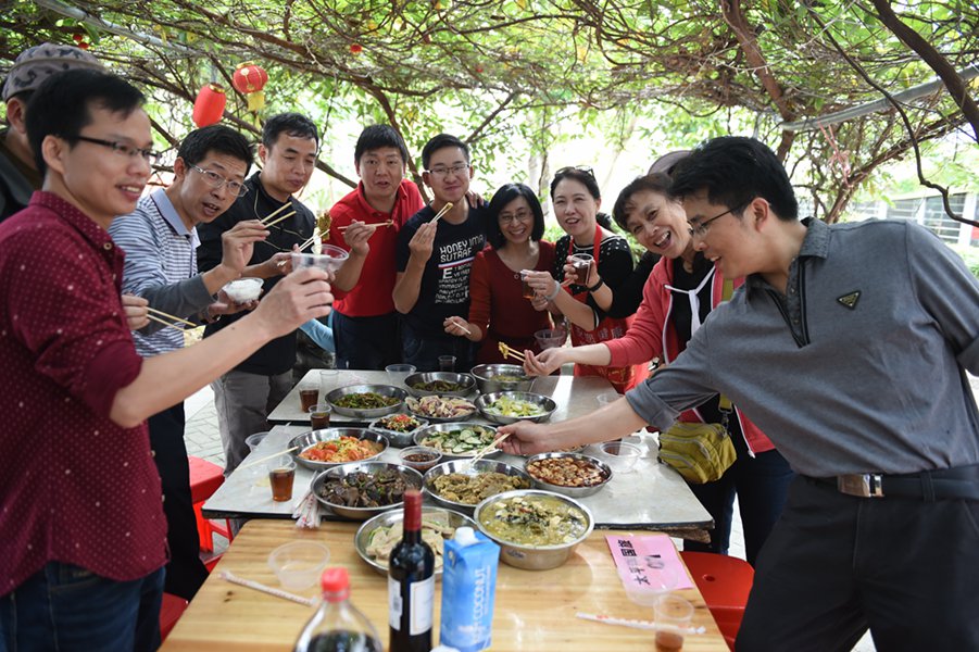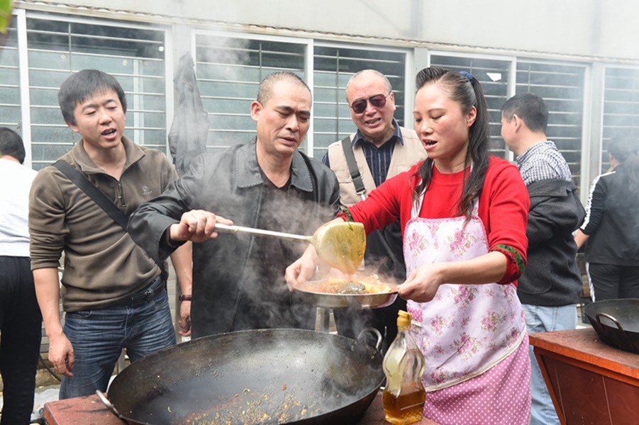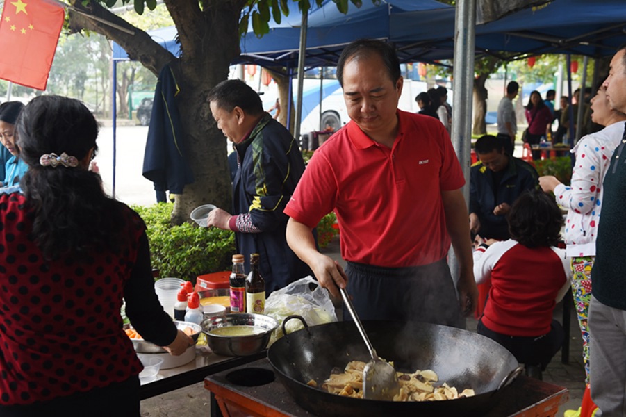 众人拾柴火焰高,众人协作饭菜香。十一点半左右,很多小组已经陆陆续续将喷香美味的饭菜端上饭桌了,有大盘鸡,口水鸡,白切鸡,水煮鱼,酸菜鱼,红烧鱼,青椒茄子,肉末茄子,蒜蓉茄子,蒜蓉生菜,番茄炒蛋,凉拌黄瓜,清炒黄瓜,酸辣土豆丝,干煸土豆,地三鲜等等,十二点左右,各个小组的饭桌上基本上都被各自的劳动成果放满了,老师们也逐渐停下手中的工作,一个个带着丰收的喜悦围坐在饭桌旁,迫不及待地拿起碗筷享受自己动手烹制的美食,边吃边热情地向食堂的大厨评委、向临桌、前后桌展示自己的劳动成果:只见餐桌上川菜、粤菜、湘菜、东北菜……南北菜式,应有尽有,一盘盘,一道道都色香味俱全,让食堂大厨评委都不禁感叹:中学部的老师真是卧虎藏龙啊,以后我们要更多交流,互相学习!听了大厨的夸赞老师们吃得更欢乐了,全程津津有味,席间欢声笑语,直到“光盘”才心满意足地起身。最后大厨评委们根据菜的刀功及成品的色香味等综合因素对各个工会小组的菜肴打分,初三年级组,学生处,教务处的菜品脱颖而出,其他各工会小组的菜肴也让大厨们赞不绝口。(文/王倩 图 /电教室)