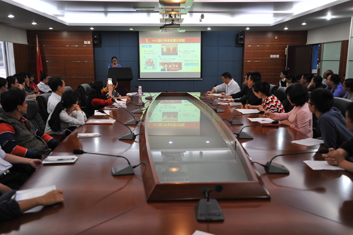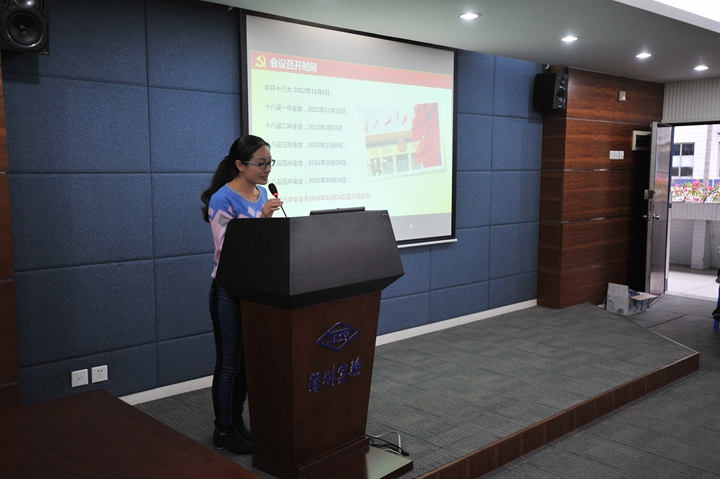 党的第十八届中央委员会第六次全体会议,于今年的10月24日至27日在北京举行。“全面从严治党”是本次全会的核心主题。习近平总书记在11月2日就十八届六中全会精神的宣讲工作也做了重要部署,他强调:宣讲工作要联系实际学深悟透,做到三个“讲清楚”。首先,把握精髓要义,把新形势下加强和规范党内政治生活、加强党内监督的必要性和重要性讲清楚;其次,把全会提出的重大理论观点和重大举措讲清楚;再次,把全会对全党特别是领导干部提出的要求讲清楚。罗贤珊老师首先带领党员教师回顾了十八大以来的不同阶段的国家重要部署,重点分析了十八届六中全会精神;随后就《关于新形势下党内政治生活的若干准则》的总结归纳了14个新提法和27个新亮点,做了详细的解读。