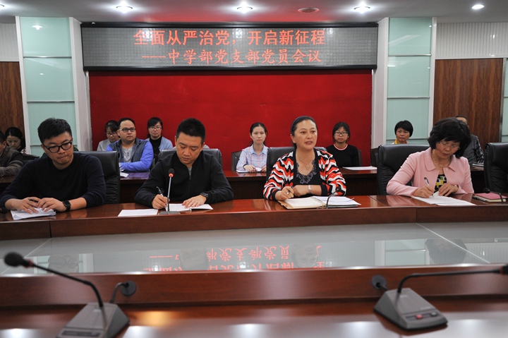 12月14日下午,在“两学一做”学习教育中,中学部党支部开展“全面从严治党,开启新征程”——十八届六中全会精神主题宣讲党课。中学部全体党员教师参加了本次党课学习,党支部宣传委员罗贤珊老师主讲。