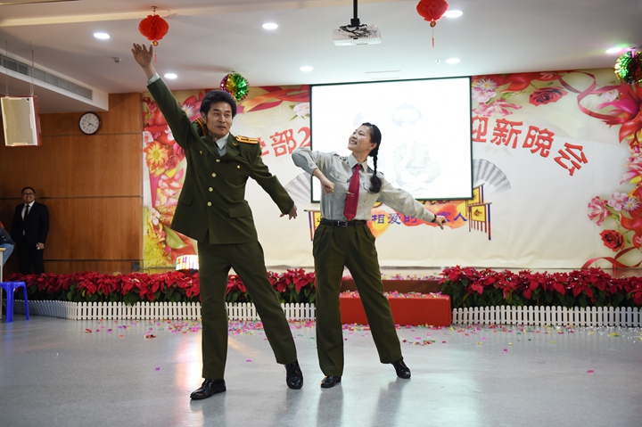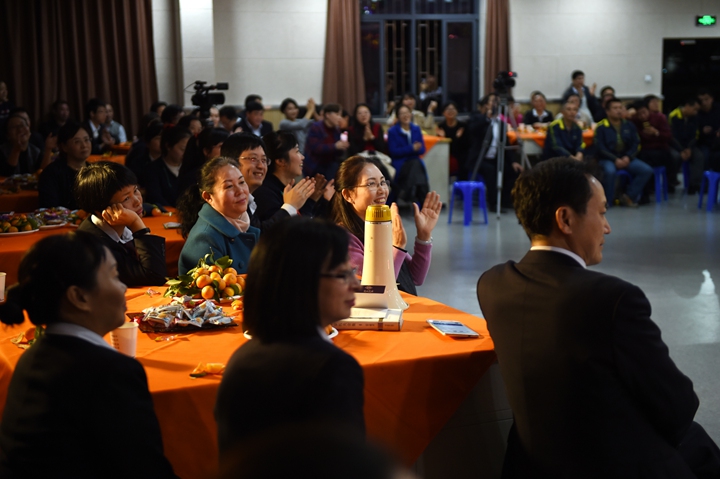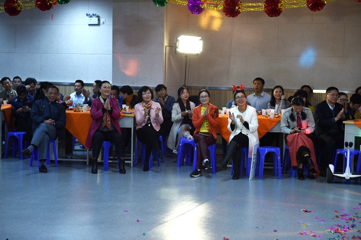 晚餐后,“相亲相爱一家人”迎新联欢会在龙校长的新年祝辞中拉开序幕。学生处赵丽媛老师一首《套马杆》,唱出了实验人的热情与豪迈;随后,初一年级组的方言诗朗诵《实验啊,实验》、2016年新入职青年教师小品《列车趣事》、高一年级组搞笑联唱《换大米》作为本场联欢会的“快乐使者”,将欢乐传递;初二年级啦啦操将活力与热情散播给在场的每一位老师;根据热播的电视节目《年代秀》改编的情景剧由高二年级组演绎得精彩绝伦;初三年级“小虎队”三位教师一展歌喉,唱出青春的味道;教务处带来的情景表演《大王叫我来巡课》更是将校园日常工作生动呈现;唐尧老师的一首经典美声独唱,悠扬的歌声在现场回荡;高三年级组的电影原声配音《疯狂动物城》,把大家带入到卡通的世界,唤起了我们的童心;属鸡教职工联袂出演的悬疑歌舞剧《小鸡 小鸡》,为联欢会增添了浓浓的新年喜庆气氛;中学部工会主席朱元瑞老师独舞《远方的妈妈》,那舒展、轻盈、曼妙的舞姿,饱含深情的演绎,博得了满堂喝彩,将本次联欢会推向高潮!