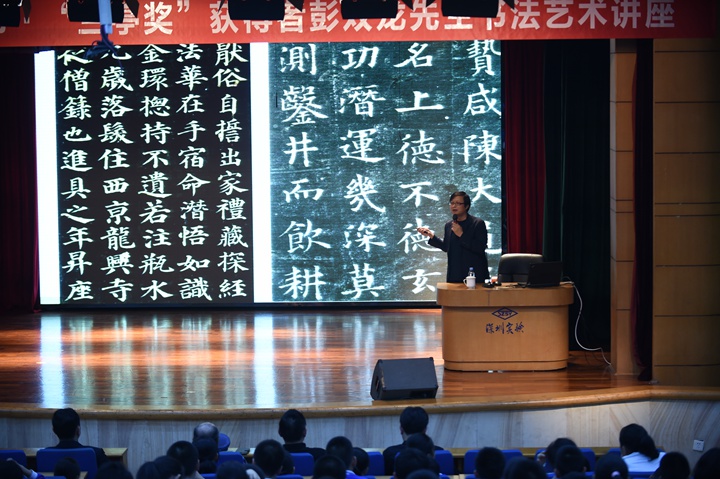 彭老师首先介绍了书法的分类和发展史,让我们明白了何为书法,也让我们了解了书体从甲骨文到行书的演变。然后老师带领同学们鉴赏了王羲之的《兰亭序》、颜真卿的《祭侄稿》和苏轼的《黄州寒食帖》等名家碑帖。彭老师还以碑帖中的某个字为代表,讲述每位名家的书法特点及其字体的构造和写法。王羲之的飘若浮云,矫若惊龙;颜真卿的圆润流畅;苏东坡的磅礴大气,无一不让我们看到了天下三大行书的惊才绝艳和三位先辈书体的绝代风华。随后彭老师向同学们传授了书法的学习方法,同时在现场书写了遒劲有力的“博文明理”这4个字。