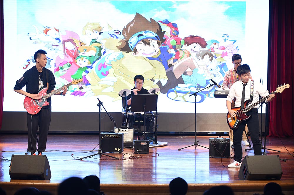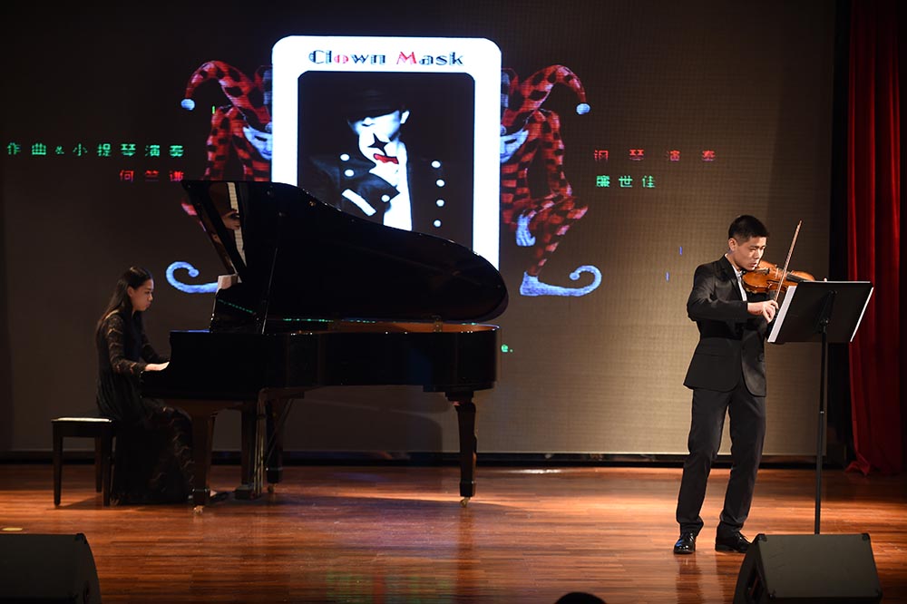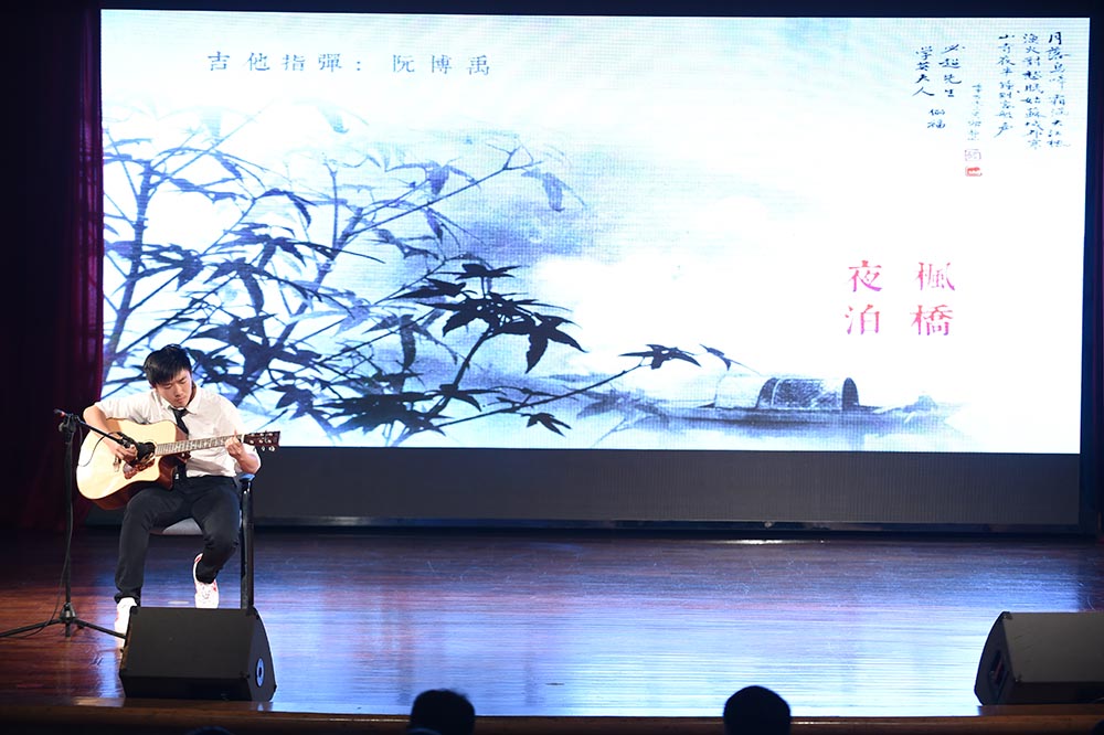 接下来上场的节目是高二年级的学生流行乐队Fusion,热衷于改编流行歌曲的他们带来了欧美天后Adele脍炙人口的歌曲《Someone like you》,再次引起全场沸腾。在阵阵掌声中,器乐社副社长阮博禹独自持琴上台,用木琴指弹演绎了一曲极具中国风的曲目《枫桥夜泊》,琴弦一击一勾中,蕴藏格律严谨的悠扬古风。器乐社何竺谦的原创曲目《假面舞会的A大调华尔兹》,由他本人担任小提琴及廉世佳担任钢琴演奏,这首曲子充分展现了社员何竺谦出色的创作能力和社团丰富的音乐性。