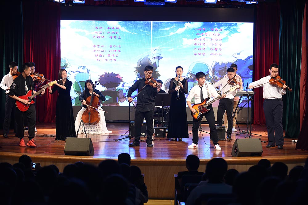 主持人简洁开场之后,灯光渐暗,舞台前方三块屏幕播放“日冕”片头视频,恢弘震撼。随后幕布缓缓拉开,熟悉的流行摇滚响起,器乐社的LEAK乐队以一首《王妃》点燃了整个现场,极具力量的节奏旋律带来了日冕的初光。紧接着是一首反战意义的和风歌曲《千本樱》,如此一首耳熟能详的初音歌曲,经由改编,重新在舞台上以弦乐五重奏的形式演绎呈现。当最后一个音干净利落的消失之后,一架钢琴被缓缓推入舞台中央,黄靖哲同学带来的一首《Wins of piano》带领我们走进古树旋律的温柔乡;而另一首双木吉他曲《风向仪》更把这份柔情在每个认真聆听的观众心中编织成了一朵柔软的花。