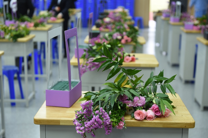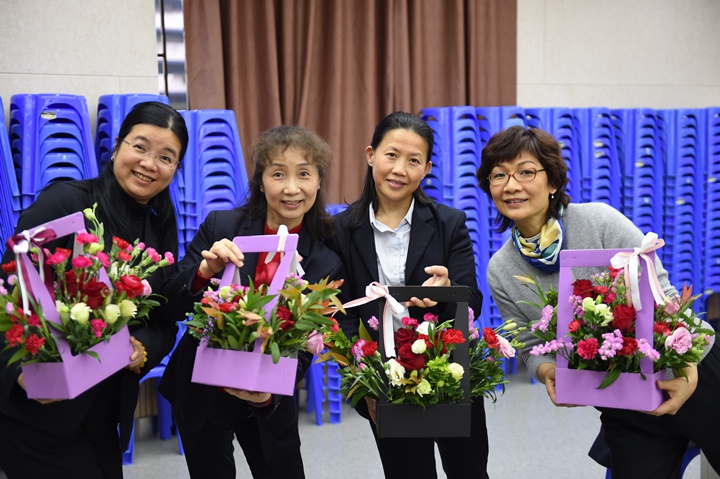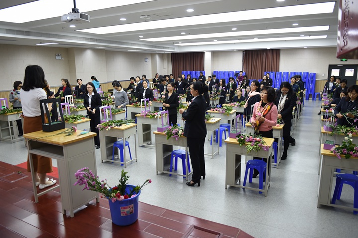 温柔明媚的三月悄悄地向我们走来。三月,一个属于花的季节,一个属于女人的节日!在国际“三•八”妇女节来临之际,为进一步提升女教工的生活品位,在龙校长的大力支持下,中学部开展了系列活动。3月7日下午4点,满心期待的女同胞们提前聚集在西楼多功能教室,走进艺术沙龙——插花课堂。课桌上整齐摆放着绚丽多彩的鲜花、娇翠欲滴的绿叶,以及精致的纸花篮和飘逸的彩带,温馨的布置令人陶醉。