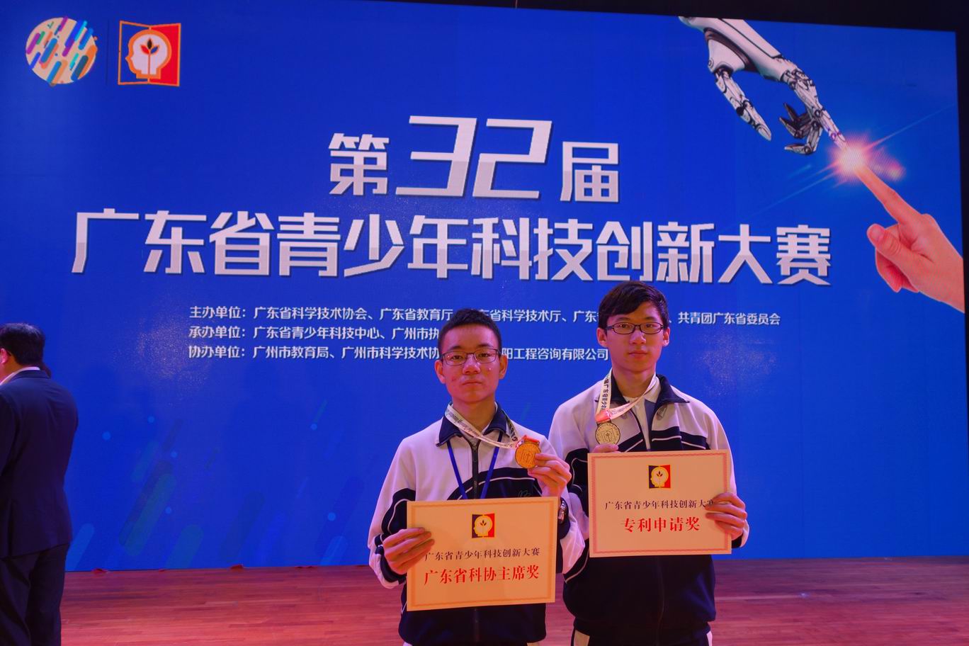 一树红棉灿碧空,全省英才展芳华。3月17日至19日,第32届广东省青少年科技创新大赛在广州市隆重举行,这是我省青少年科技英才的大聚会,全省青少年科技教育工作者的大团圆。中学部学生游江山、李明泽参加本次大赛,不仅夺金夺银,而且获得了两项专项大奖。