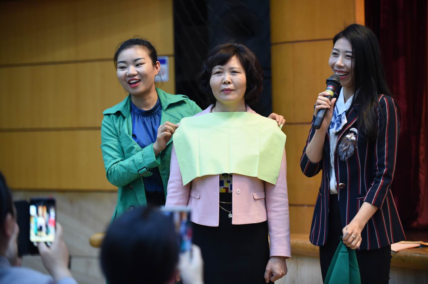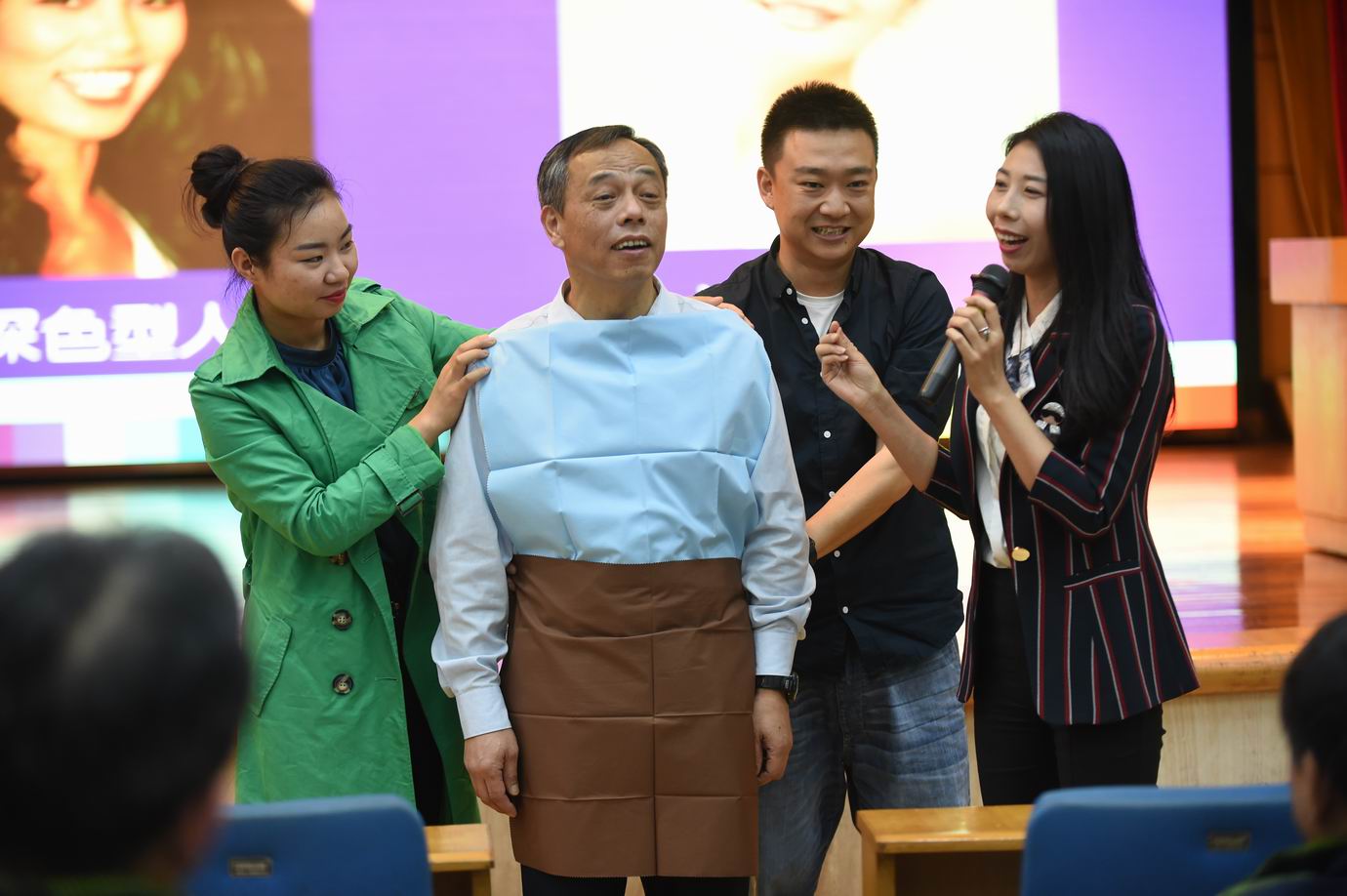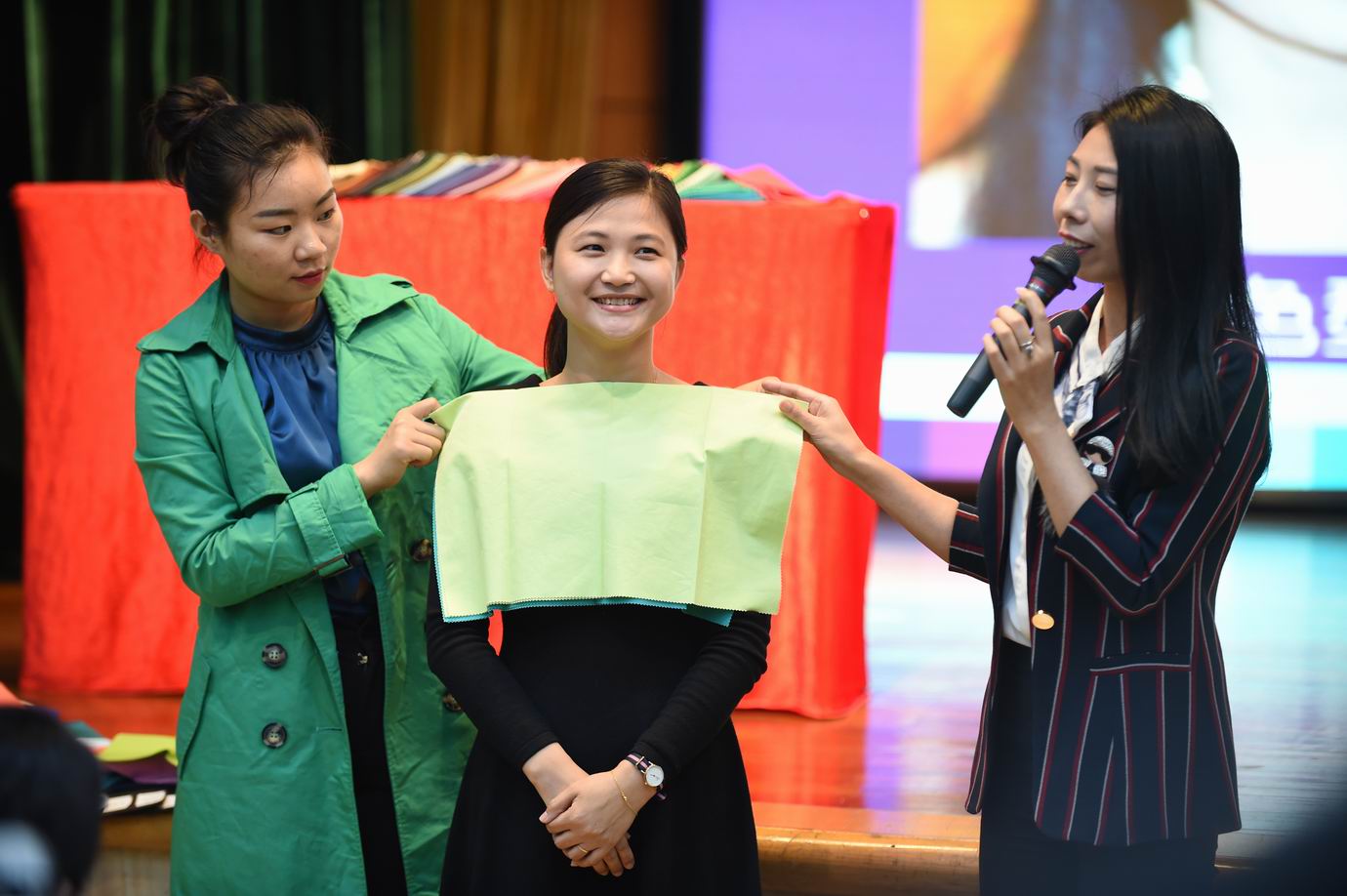 讲座开始,吴老师就通过真实案例让我们意识到——人际交往中,服饰很大程度上反映了一个人的社会地位、身份、职业、收入、爱好及一个人的文化素养、审美品位。接下来,她向我们介绍了浅色型人、深色型人、净色型人、柔色型人等八大不同型人。为了让我们更精准地选择适合自己的色系,吴老师现场随机点评在座老师并邀请有代表性的老师上台互动,现场一片欢声笑语。在了解了自己的色型之后,我们在吴老师的指导下找到了适合自己的穿衣风格。少女、时尚、优雅、少年、古典、自然、浪漫等等,总有一款风格适合你。