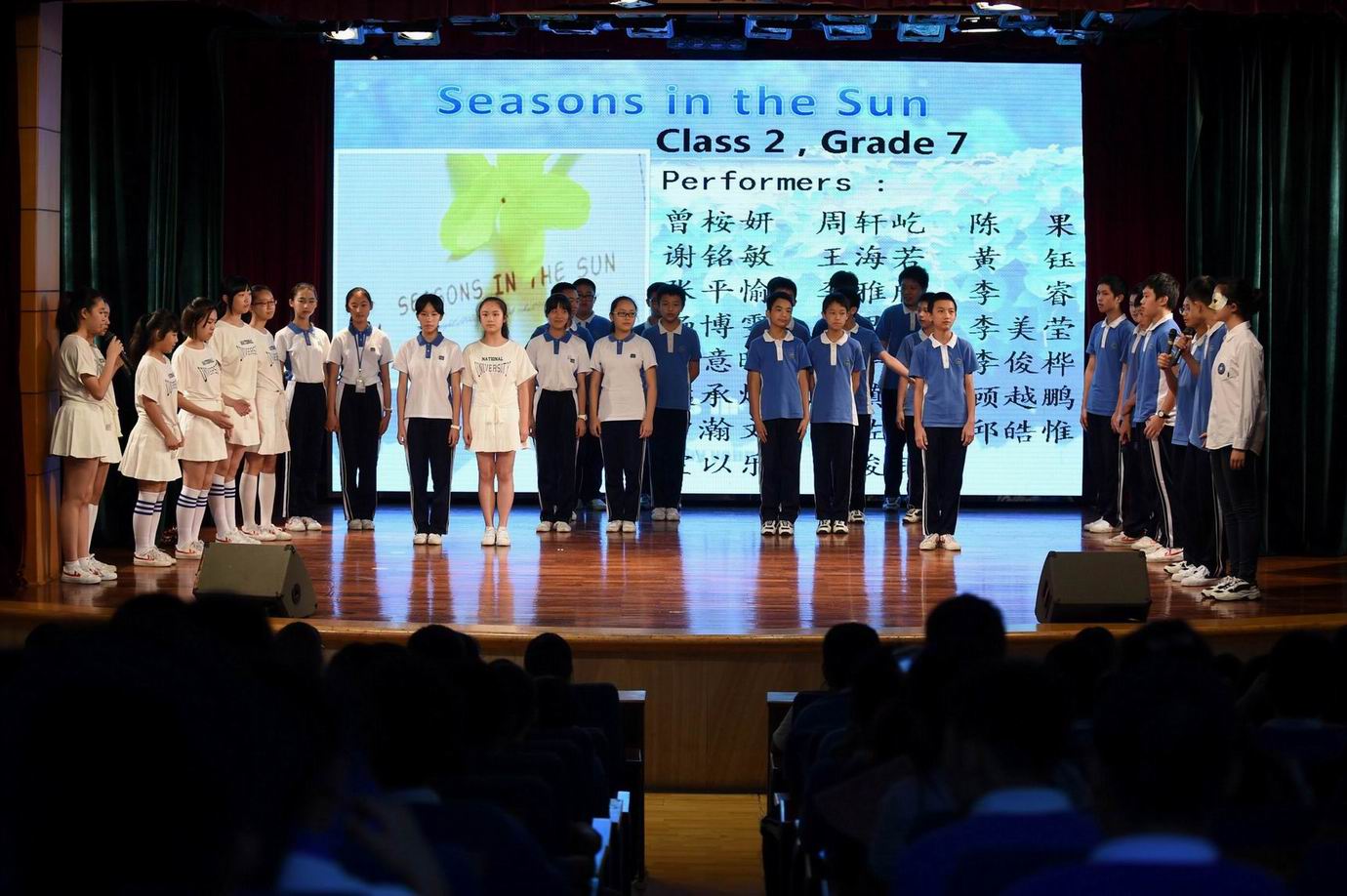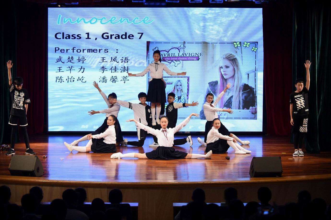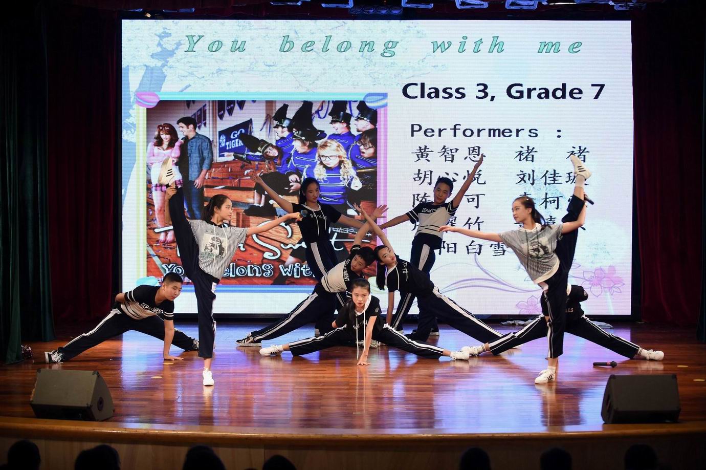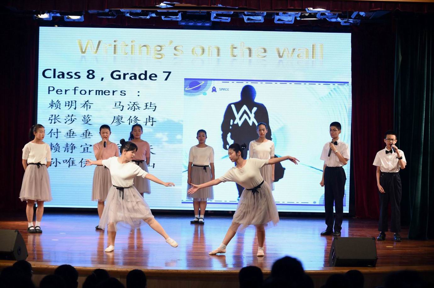 四位主持人流畅的口语,拉开了英语歌舞的帷幕。面如冠玉、目如朗星,娉娉袅袅十三余,正是豆蔻年华,这一群青春活力的初一学生在舞台上悦动着属于他们的语言艺术。初一(5)班《Be what you wanna be》、初一(7)班《Counting stars》、初一(3)班《You belong with me》、初一(1)班《Innocence》、初一(6)班《Try everything》、初一(4)班《My love》、初一(8)班《Writing’s on the Wall》、初一(2)班《Seasons in the sun》以及赖明希和钟山同学的《Hello》,流行、蓝调、爵士、摇滚在舞台上竞相绽放,青春的活力彰显着欧美艺术的独特之美。