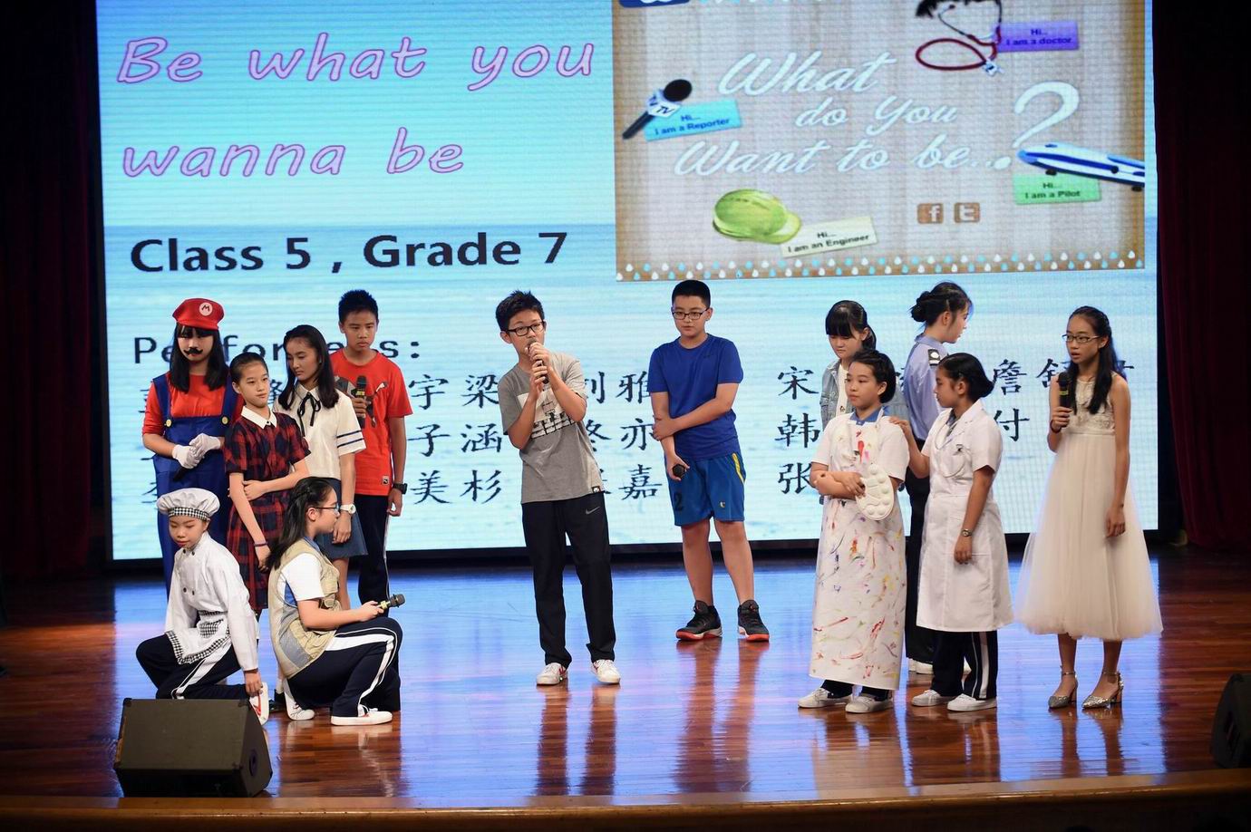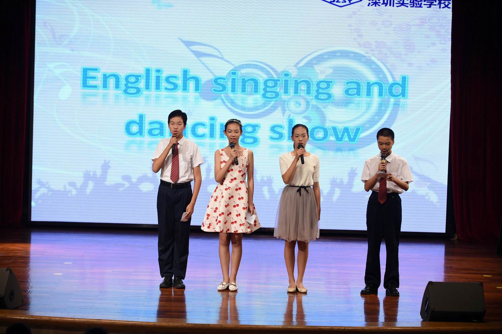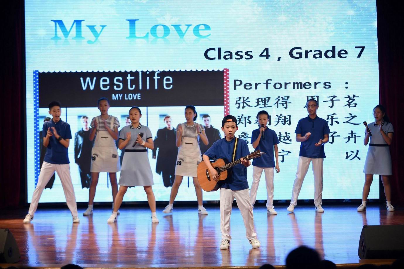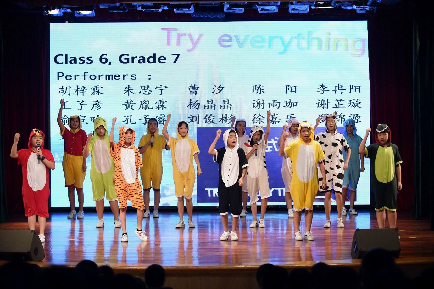 四位主持人流畅的口语,拉开了英语歌舞的帷幕。面如冠玉、目如朗星,娉娉袅袅十三余,正是豆蔻年华,这一群青春活力的初一学生在舞台上悦动着属于他们的语言艺术。初一(5)班《Be what you wanna be》、初一(7)班《Counting stars》、初一(3)班《You belong with me》、初一(1)班《Innocence》、初一(6)班《Try everything》、初一(4)班《My love》、初一(8)班《Writing’s on the Wall》、初一(2)班《Seasons in the sun》以及赖明希和钟山同学的《Hello》,流行、蓝调、爵士、摇滚在舞台上竞相绽放,青春的活力彰显着欧美艺术的独特之美。