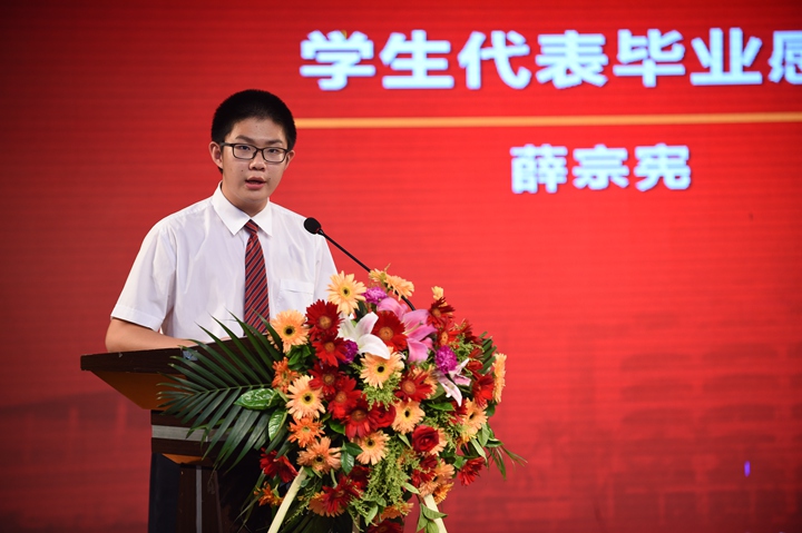 学生代表初三(8)班薛宗宪同学的发言,透着对实验浓浓的情意:永难忘,难忘我们美丽的校园;永难忘,难忘我们可敬可爱的老师;永难忘,难忘我的同学、我的队友、我的小伙伴;永难忘,难忘我们朝夕相处的三年,每一个欢乐瞬间。教师代表陈树蕾老师的赠言饱含深情,他为同学们送上真诚的叮咛和祝福,希望大家做到三个“一”:拥有一个健康的身体,保持一种良好的心态,具备一点敢想敢做的胆量。龙校长在典礼的致辞中深切期望同学们,做有情怀的实验人,并鼓励实验学子无论身处何方,你们自信的笑容就是自己最高的颜值;你们不懈的努力就是最棒的梦想;你们的未来就是祖国伟大复兴的未来!她的致辞发自肺腑,诙谐幽默,激励我们继续前行。