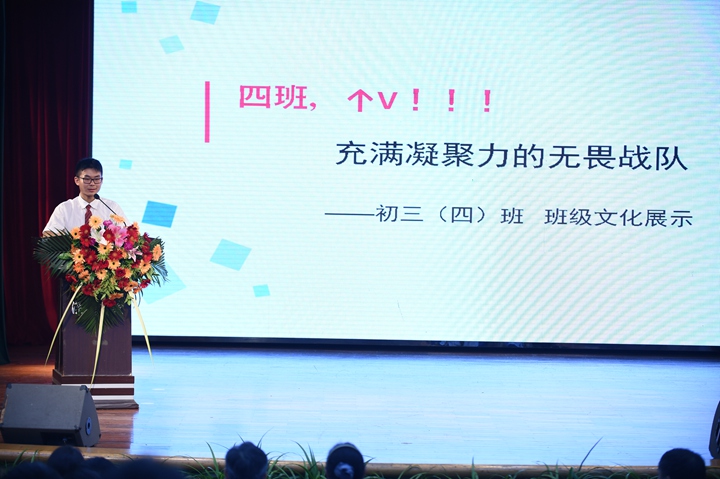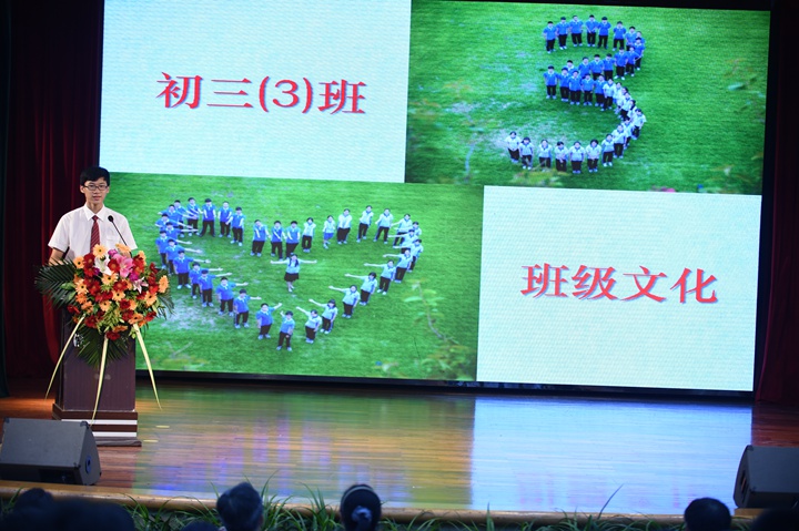班级文化展示环节,各班代表依次登台,展示班级三年实验时光沉淀在我们身上的珍宝,展示了班级文化特色,展现了学生的风采。