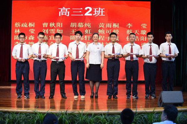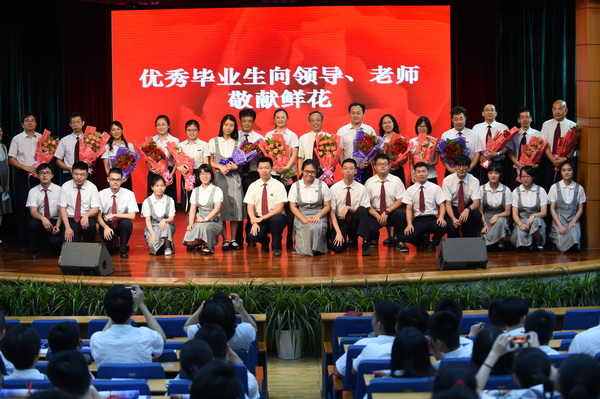 典礼最后,老师、领导上台,接受学生的鲜花和感谢。学有所成,靠自己努力,更靠老师们的辛勤培育,浓浓的师生情成为典礼最后的主旋律。老师、同学们在高中阶段最后一次相拥,那里面有感激,有不舍,有留恋,也有对未来的抱负和志向。